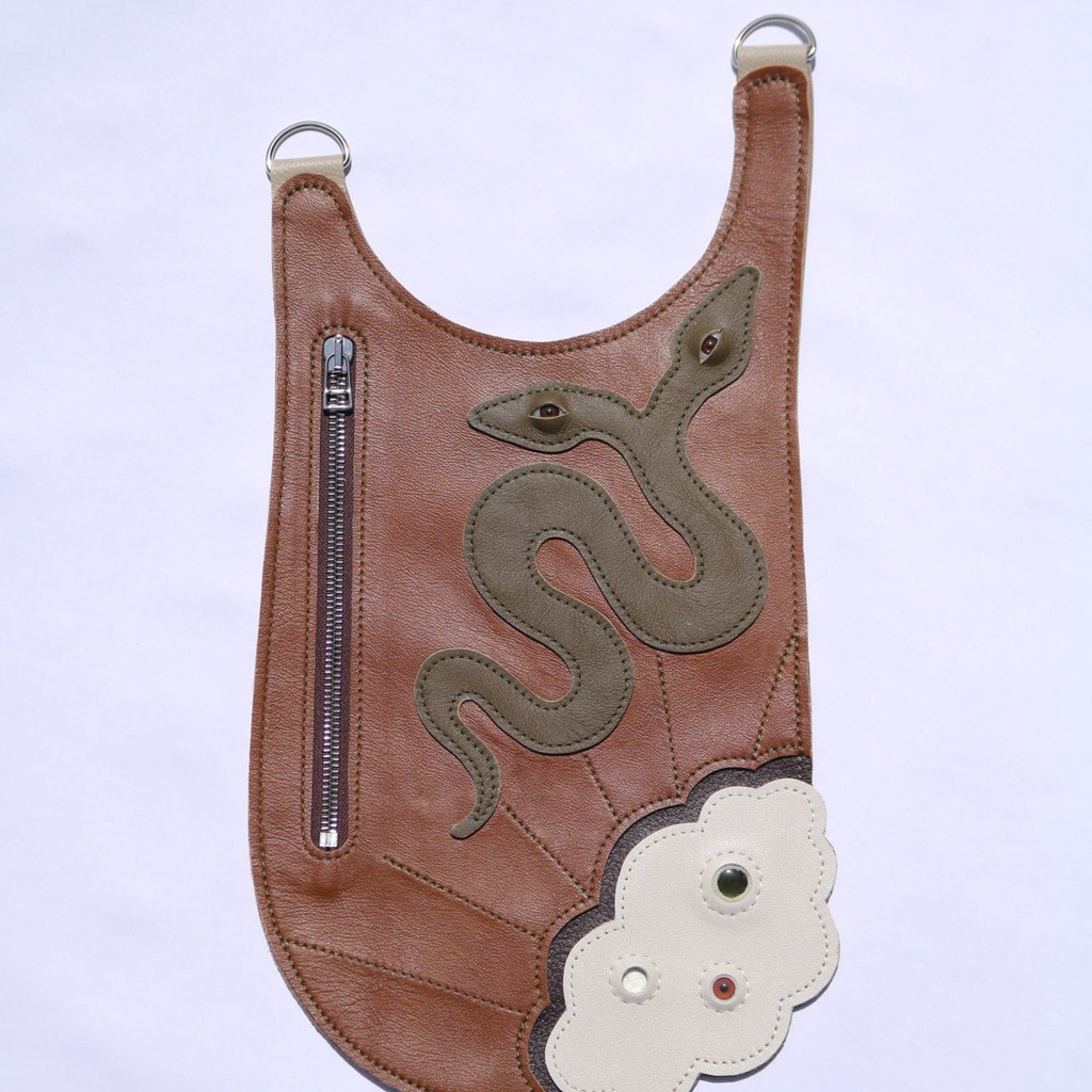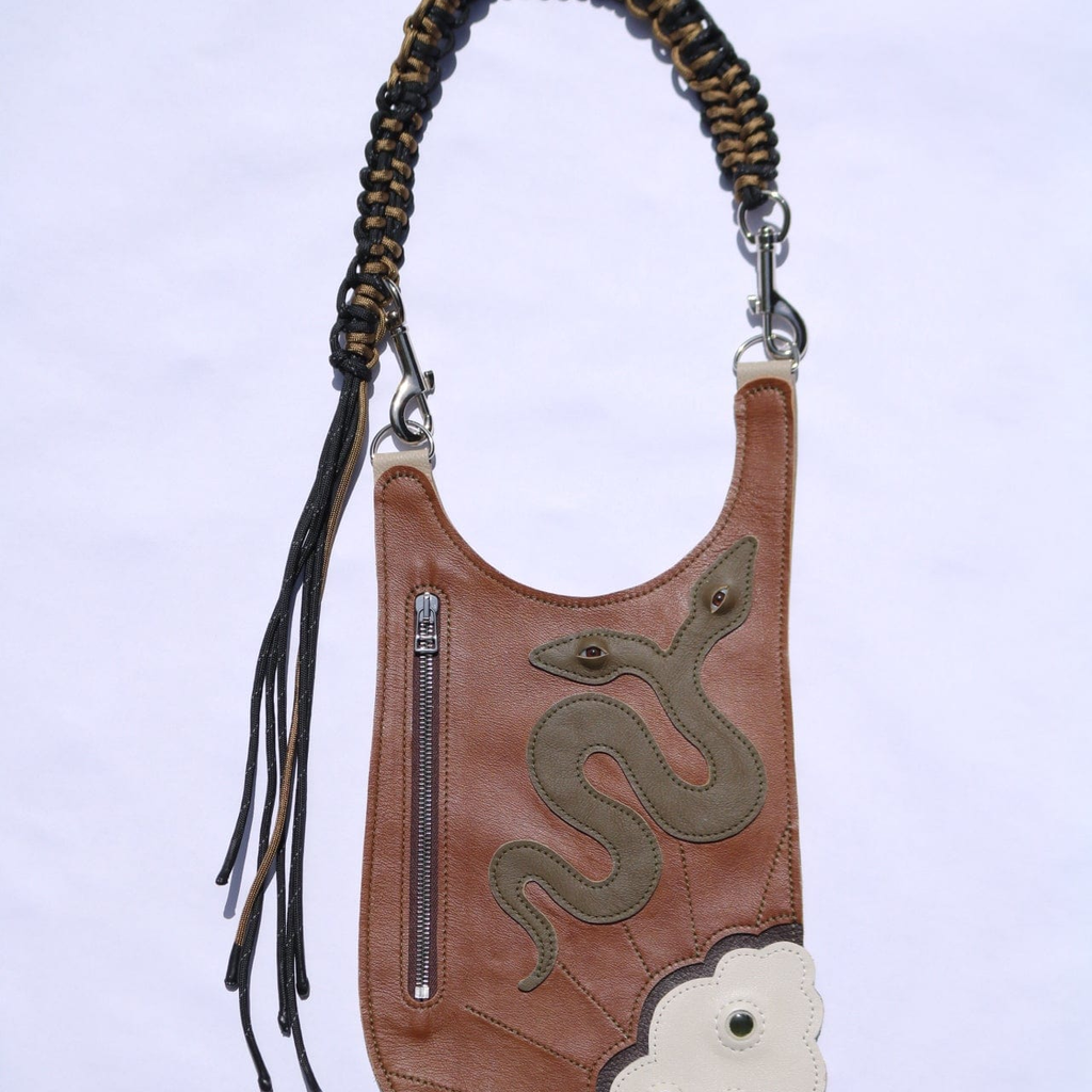Scrap leather and deadstock materials are the base of the snake bags. The sewn layers of leather create a new story for the owner. The bag has a hand-braided rope strap and a 7-inch zipper opening. The bag is a piece of art; wear it with care.