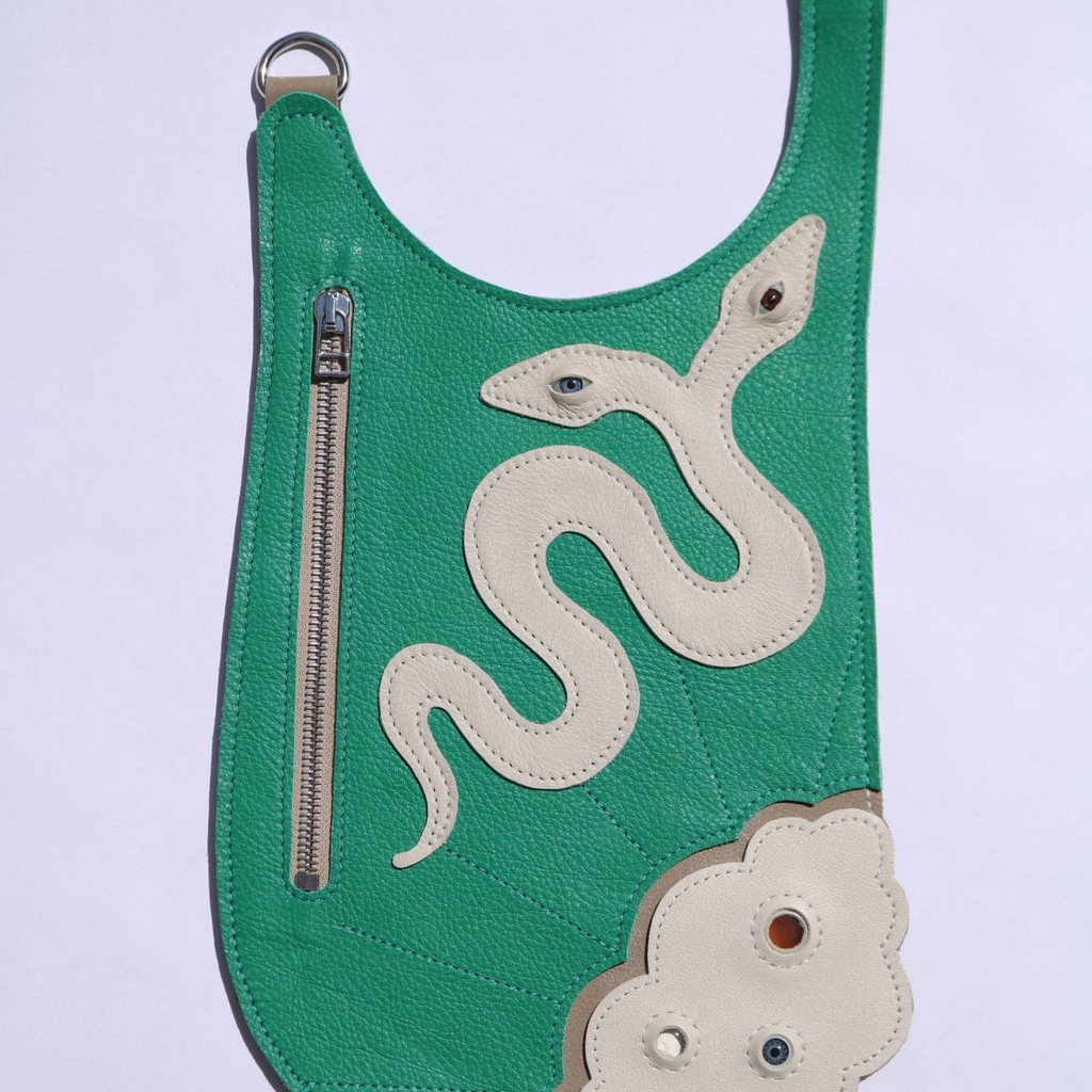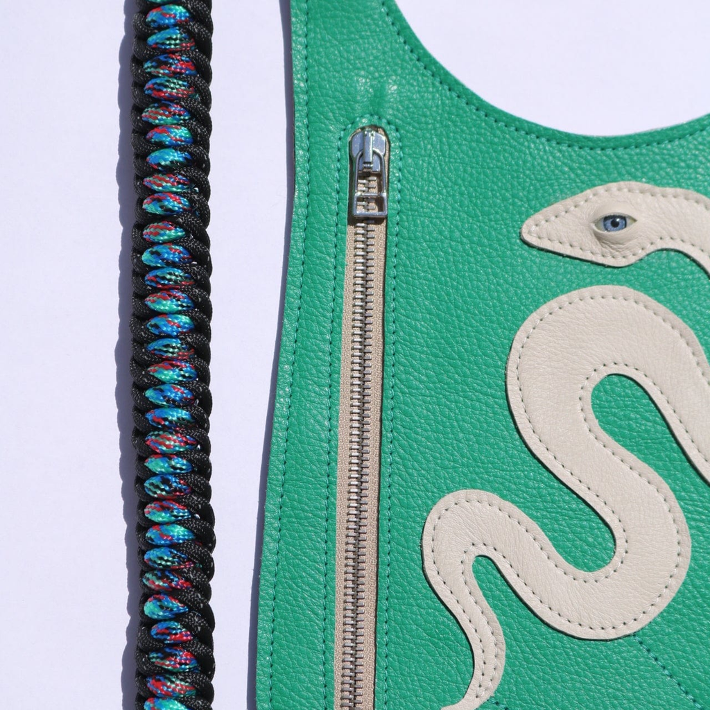 Scrap leather and deadstock materials are the base of the snake bags. The sewn layers of leather create a new story for the owner. The bag has a hand-braided rope strap and a 7-inch zipper opening. The bag is a piece of art – wear it with care.