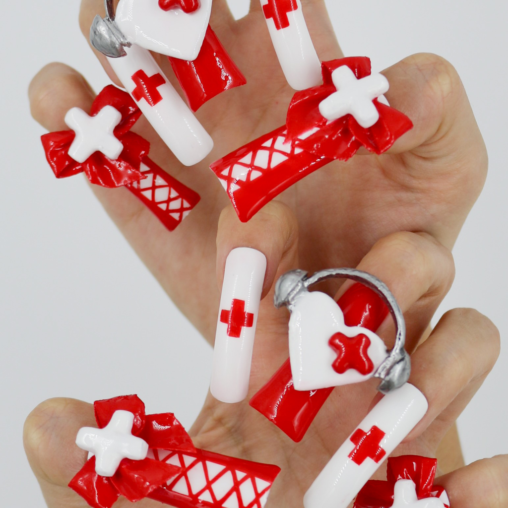 Red and white nails with 3d elements such as headphone hearts, cross and ribbons. Includes 10 nails, a cuticle stick, a file, nail glue, and nail stickers. Made to order.