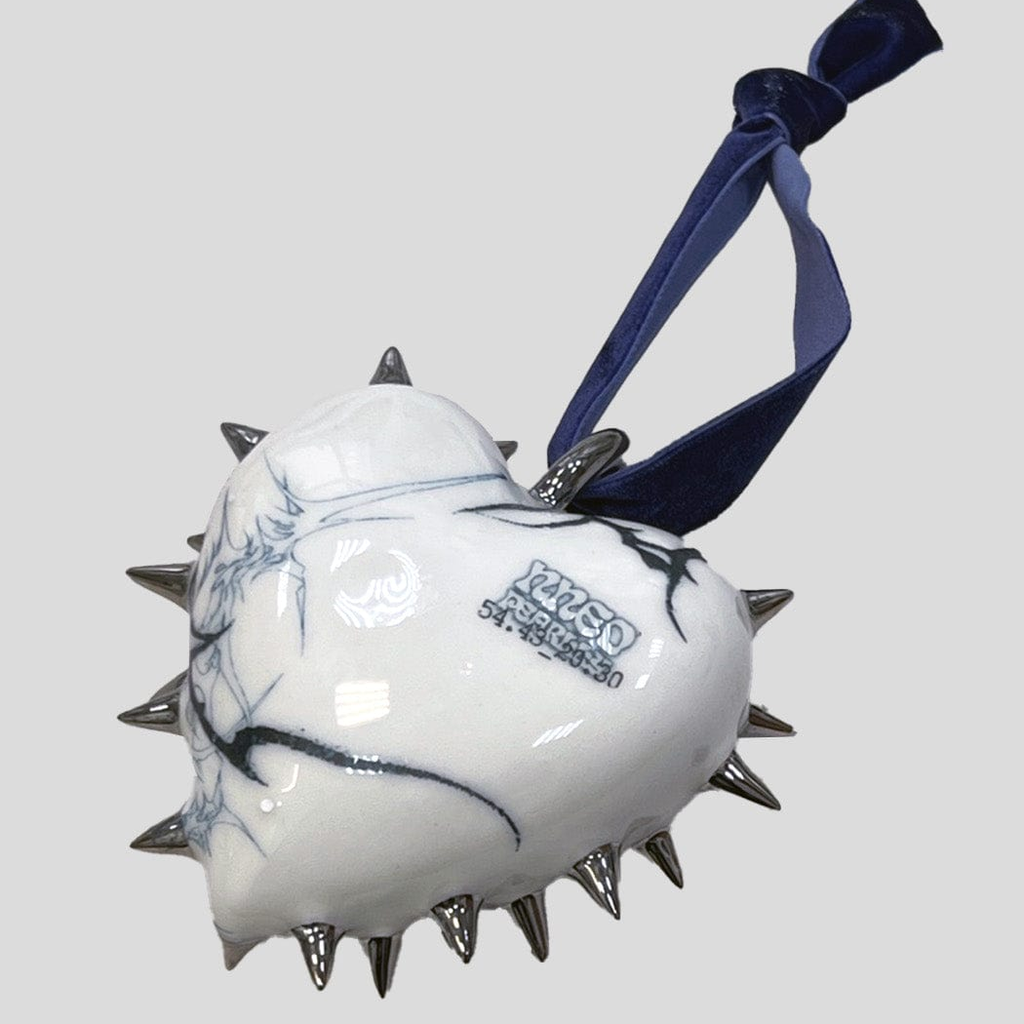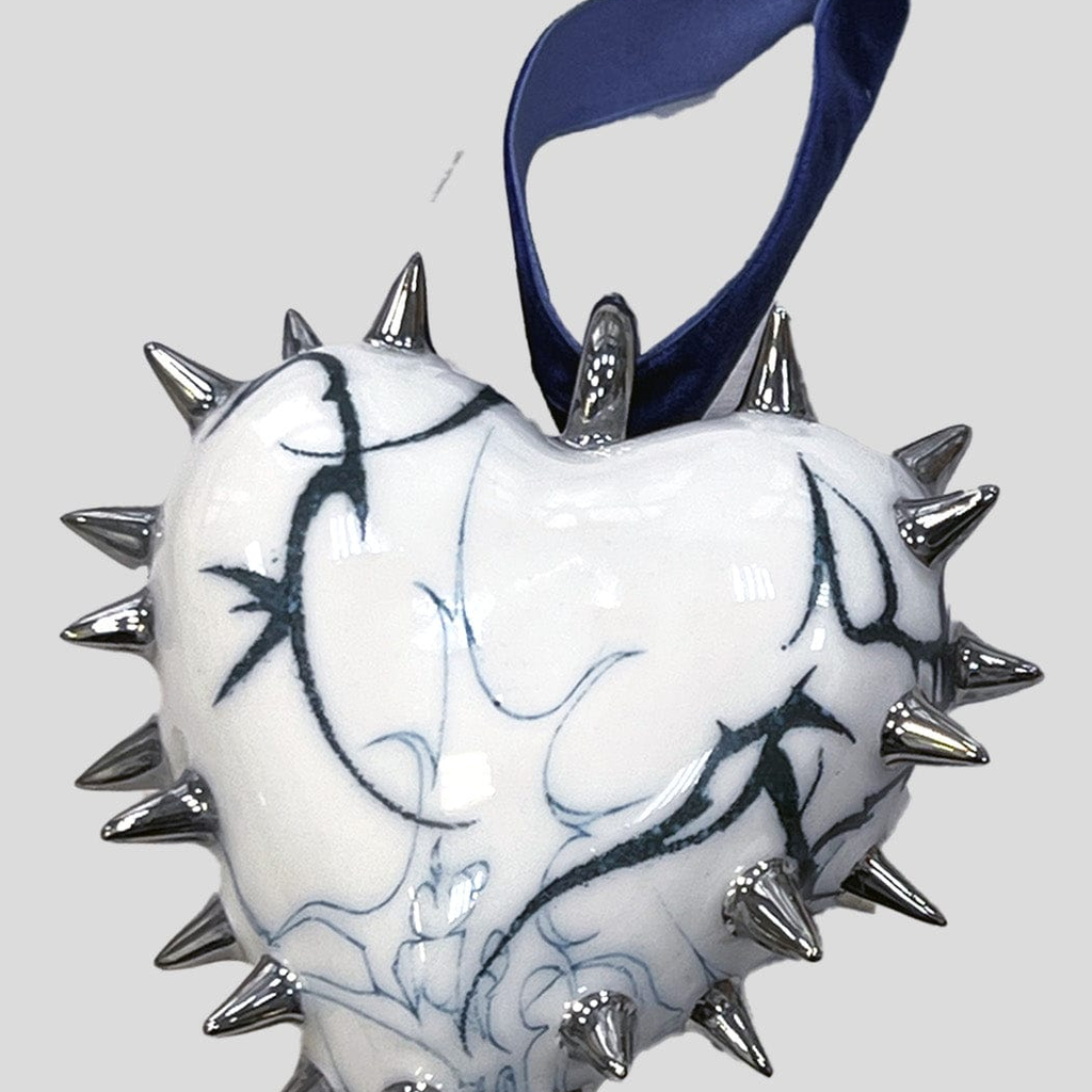 Glazed decorative white ceramic heart adorned with platinum-coated spikes and ceramic decals.