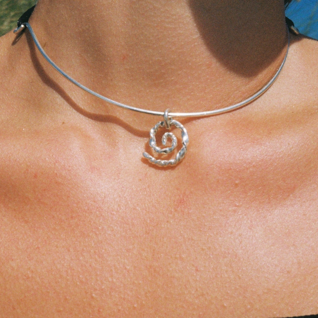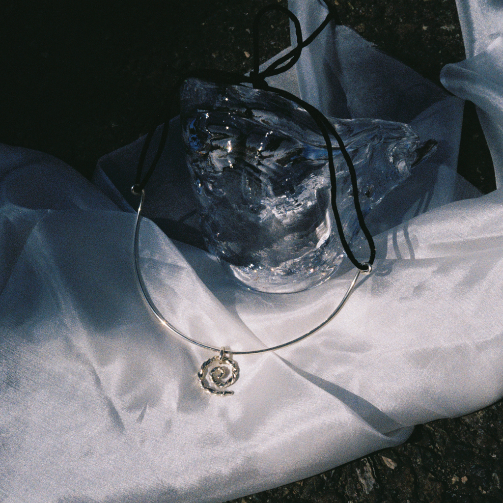 Material: 925 Sterling silver. Spiral collar is made from 2 mm silver wire and a black silk band.