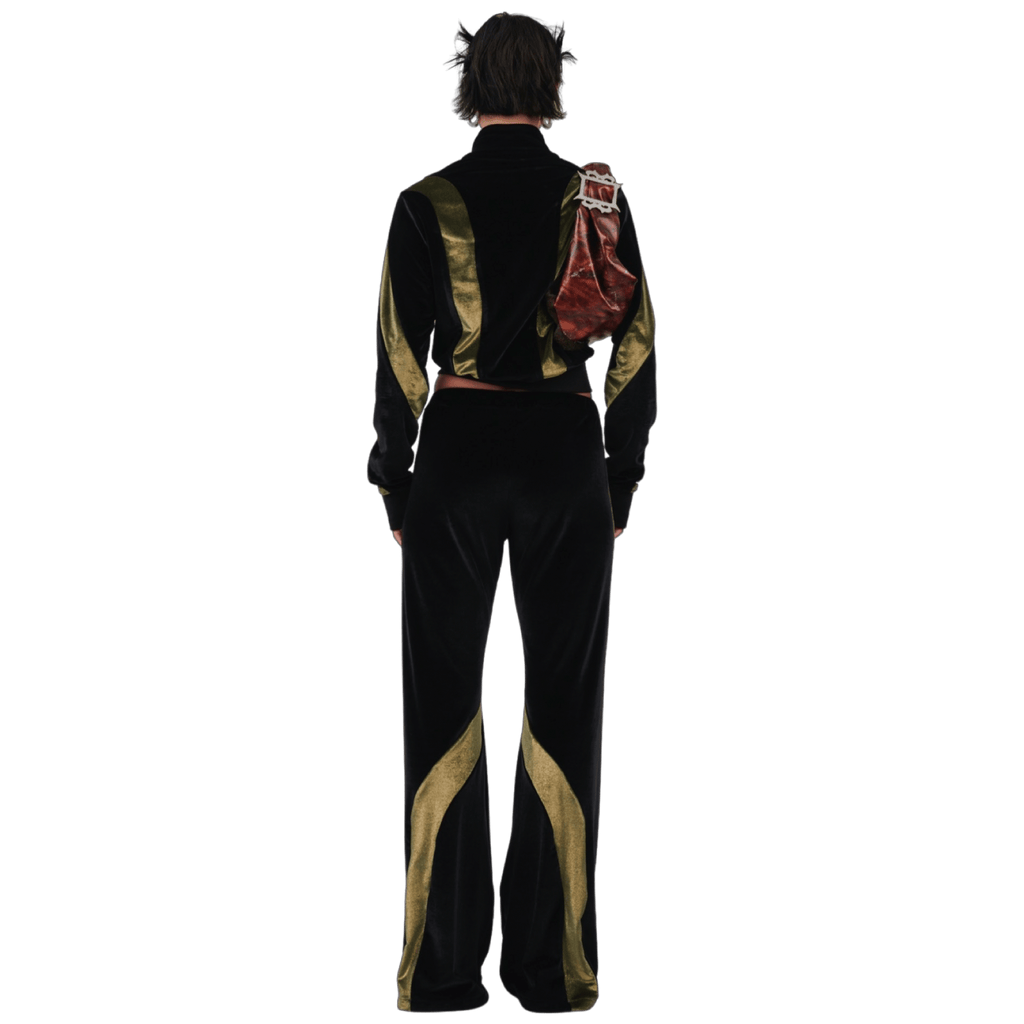 Mid rise pant with an elastic waistband. Made from two tone stretch velvets.