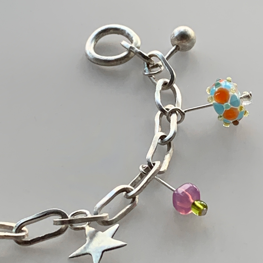 Product: Eclectic sterling silver bracelet with six charms; a claw set glass bead, star (1.5cm), silver ball, large handmade glass bead (1cmx1.3cm) along with two other squared and rounded bead charms (0.5cmx0.5cm). The bracelet is 19.5cm and has a chunky toggle clasp.