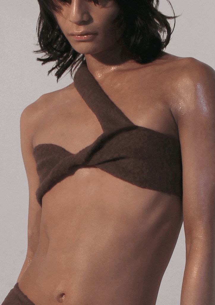 Textiles and tactics find new harmonies through the work of Jules Bramley, replicating natural uniqueness and earthly splendour. This capsule is an exploration into rebirth and transformation. Featuring organic textures, deconstructed shapes, drapery and asymmetrical features. 100% wool fabric is manipulated through deconstructing, felting and sewing with some pieces dipped and coated in natural rubber latex.