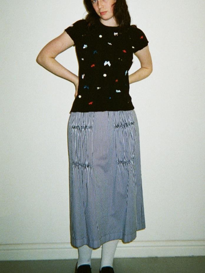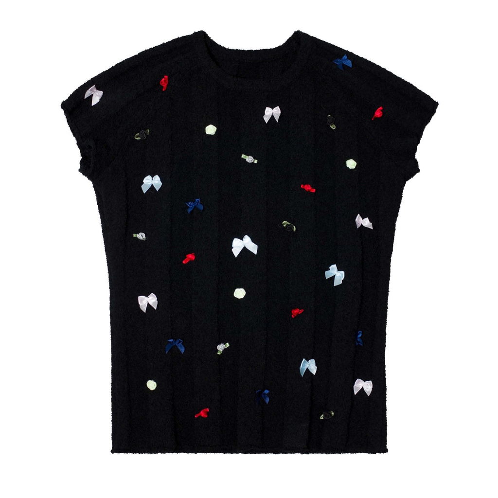 The Ilana Blumberg Flower Top in Black features short sleeves and a wide ribbed design adorned with deadstock ribbon roses and bows. Skillfully knitted, assembled, and finished by our team of two in our London studio.