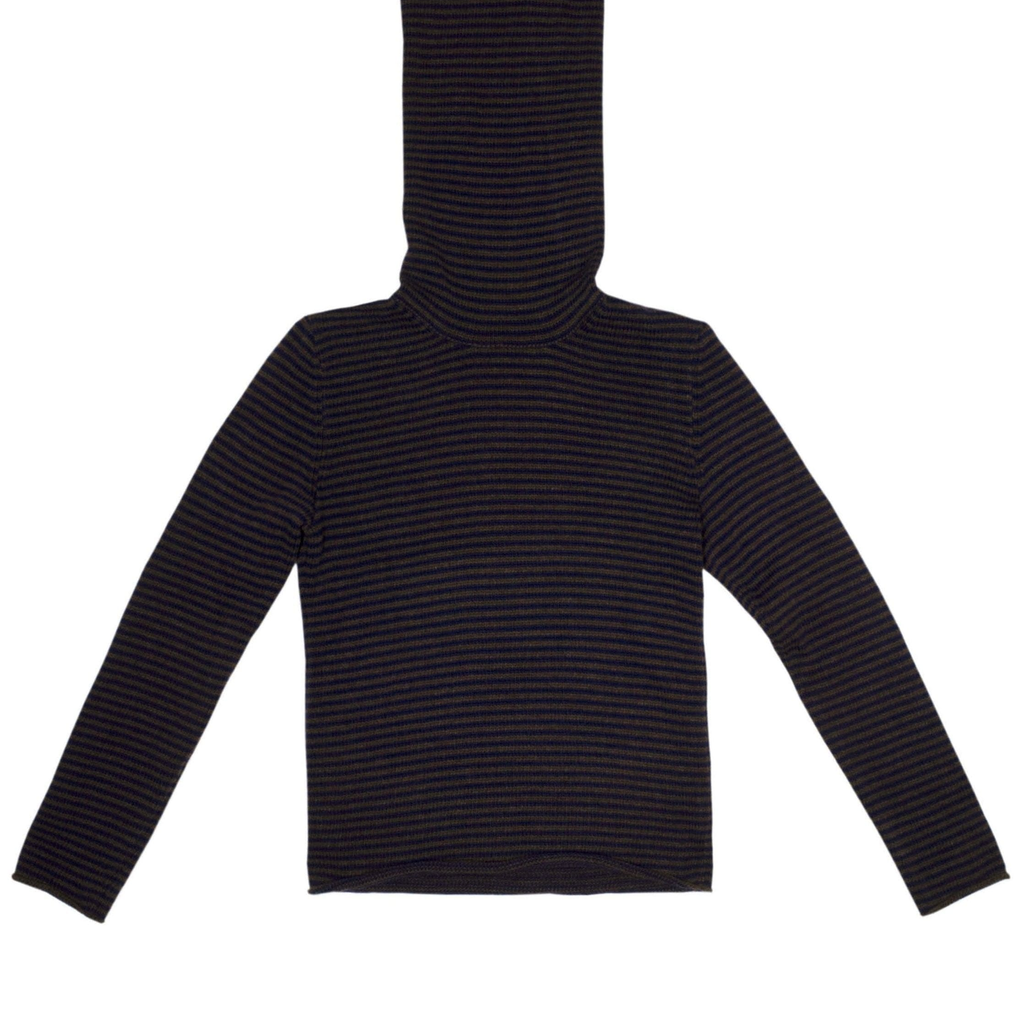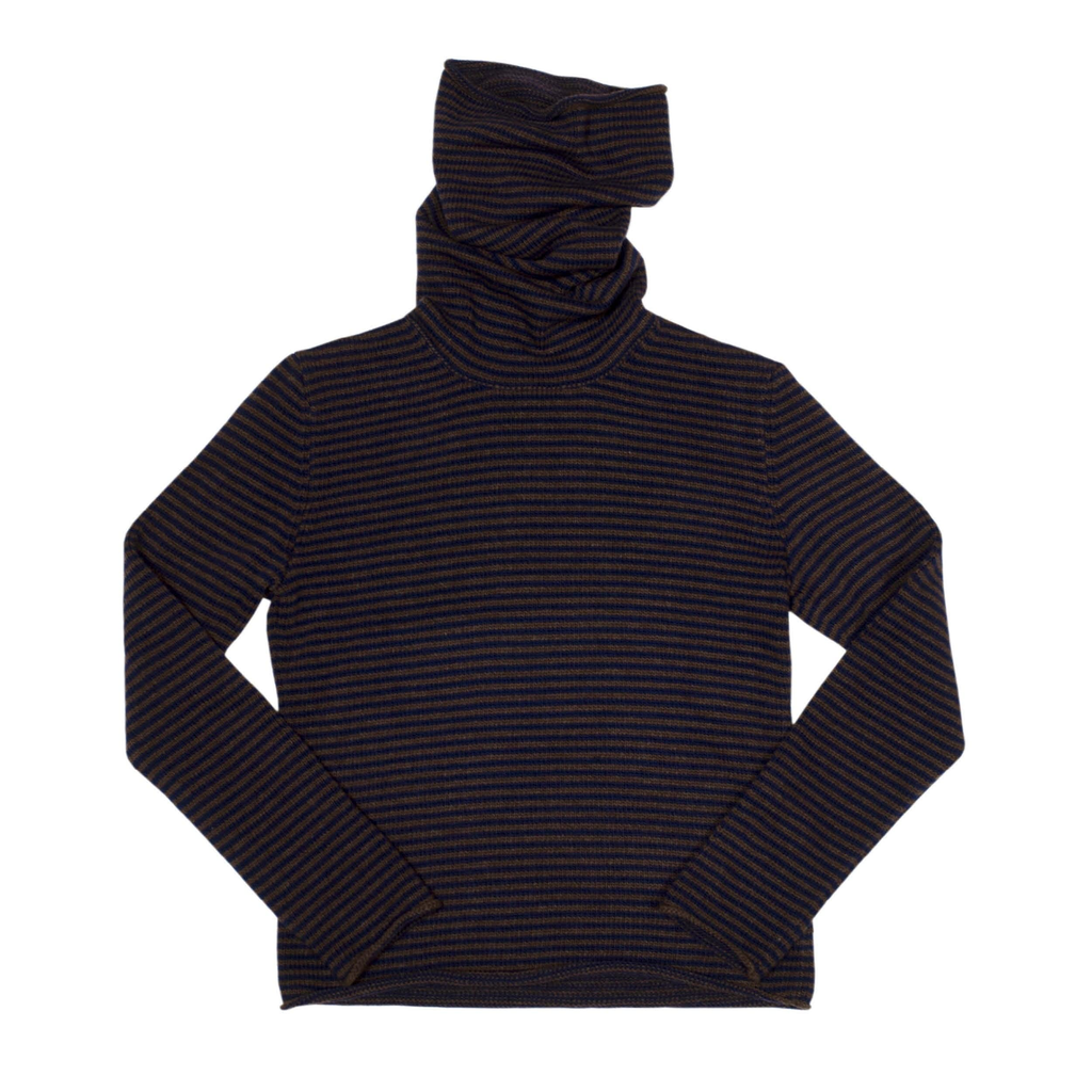 The Stripy Snood Top by Ilana Blumberg features a long-sleeve design in Navy and Brown. It includes an extra-long snood neck and is expertly made by a team of 2 in our London studio using premium knitting techniques.
