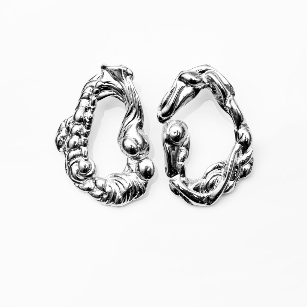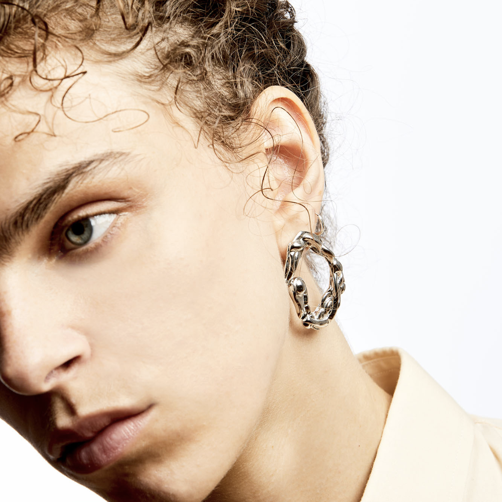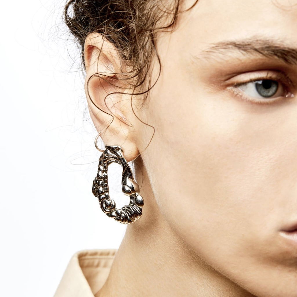 Vanessa Schindler is an eponymous fashion and accessories label based in Switzerland. A graduate of the Geneva University of Art and Design, Vanessa was awarded the Grand Prix d'Hyères in 2017 for her master's collection. In 2018 she turned to accessories and jewellery, leaving fashion to create her pieces by hand in her workshop. Her fourth jewellery collection 'Bioresin Hoops' stems from experiments with wax in water that create abstract, organic forms she likes to describe as sci-fi fossils.