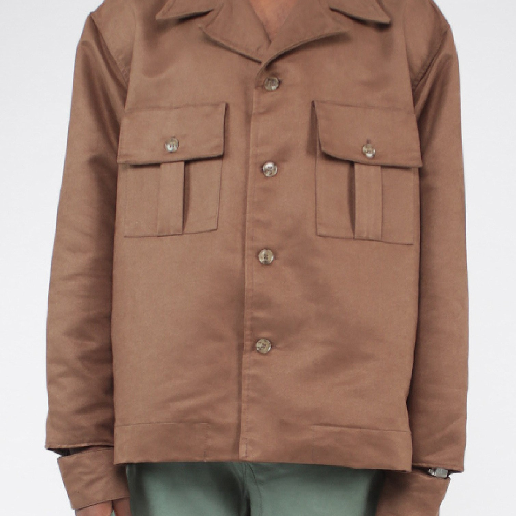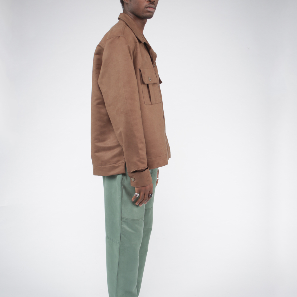 Relaxed long sleeve button up shirt in vegan suede. Open spread collar. Slit Cu . Chest patch pockets. Button Closure.