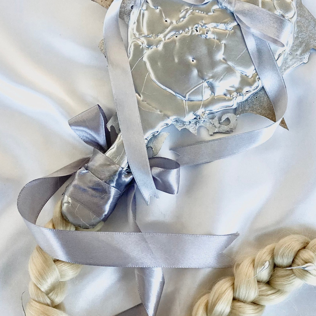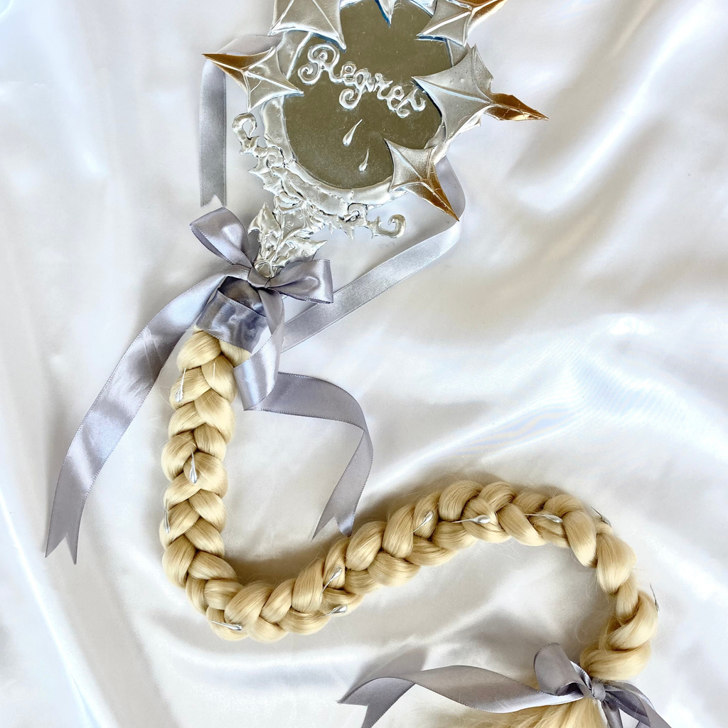 Materials: Found mirror, glass, pewter, glue, hair, ribbon, with a hook.