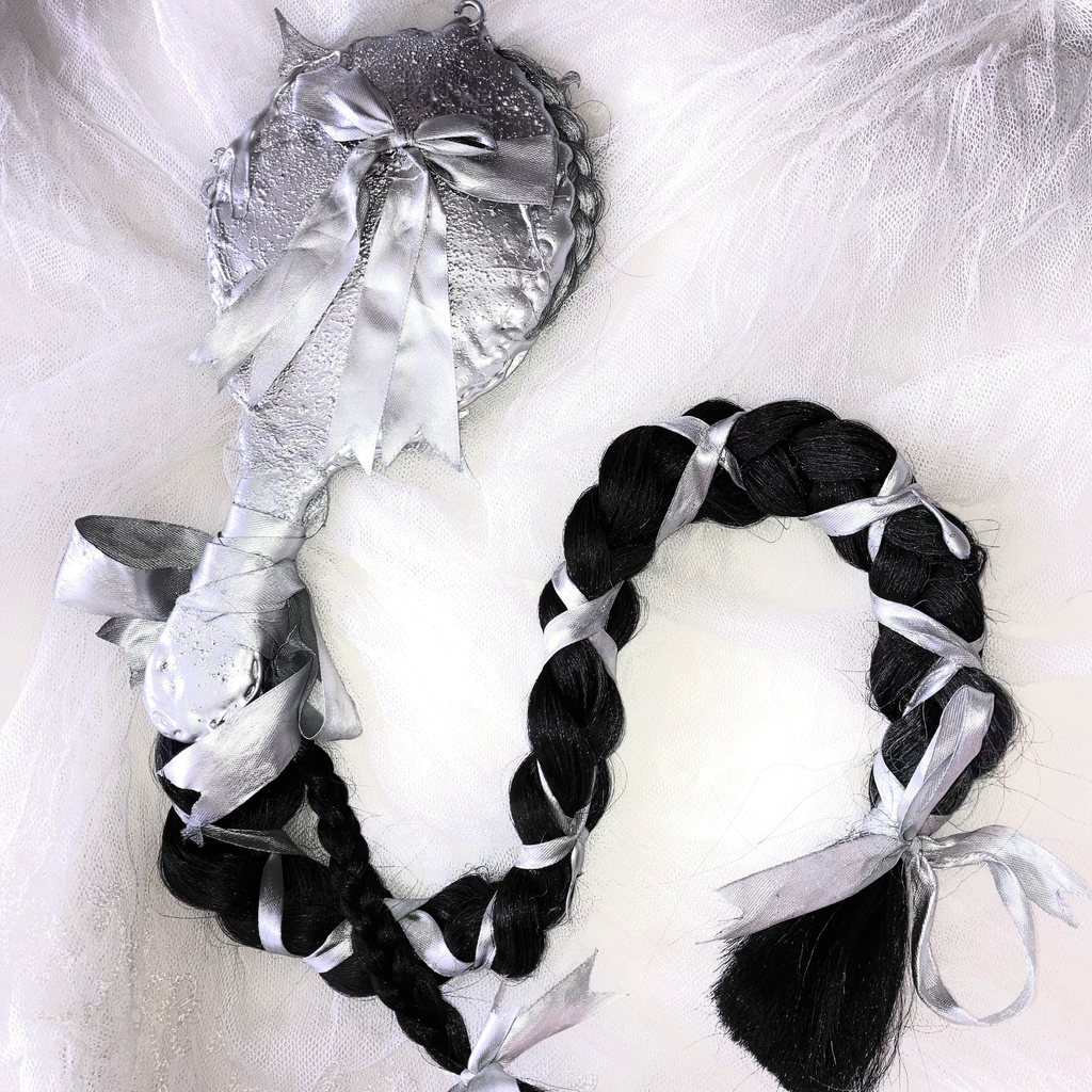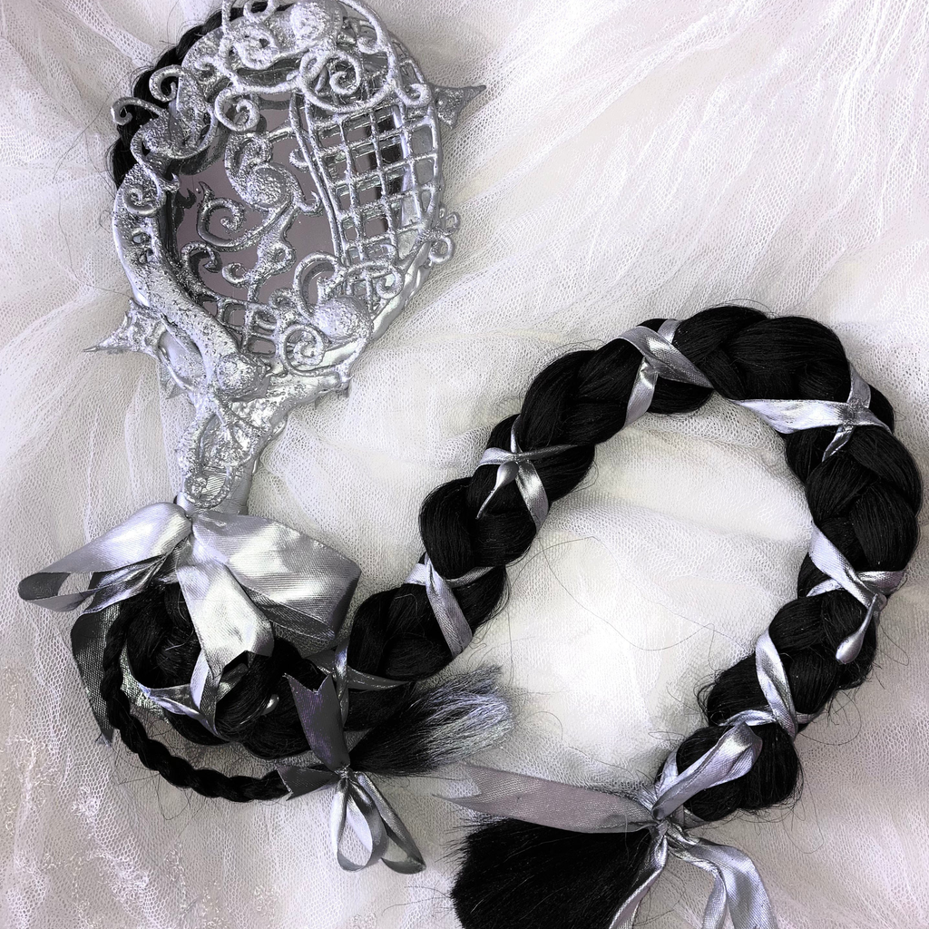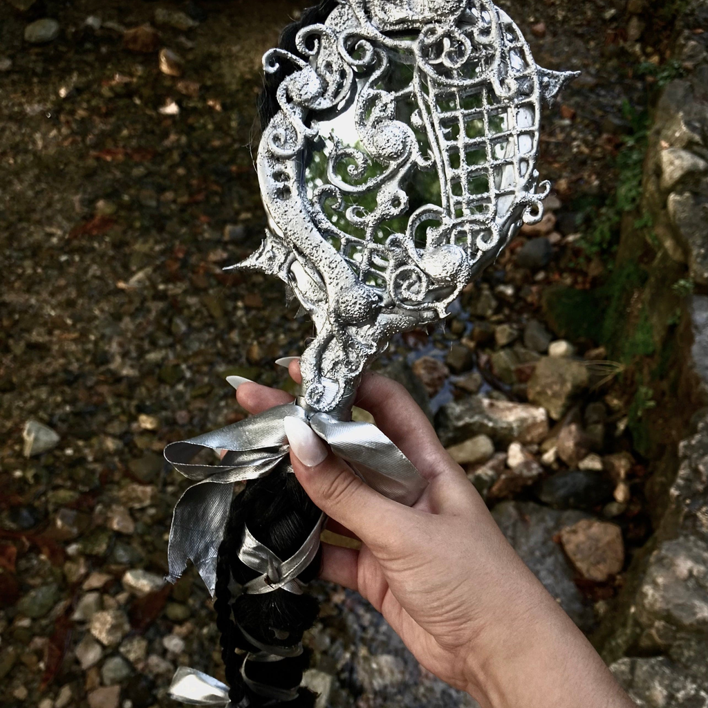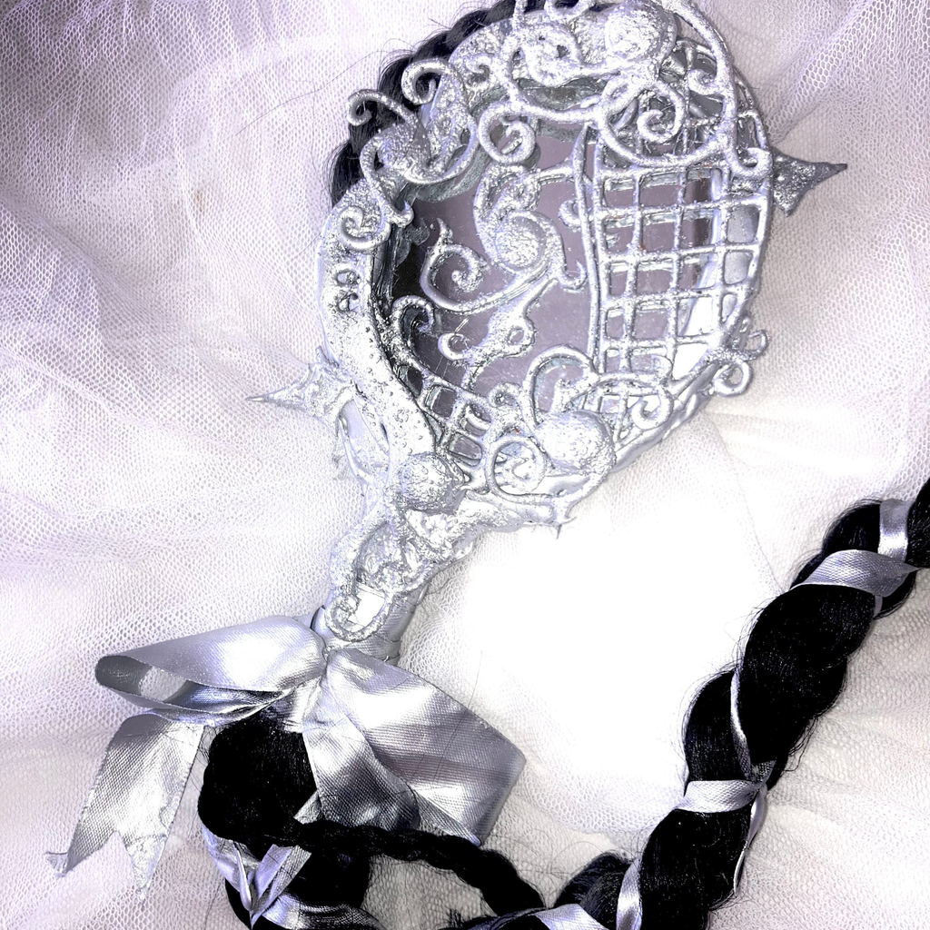 Materials: Found mirror, glass, pewter, glue, hair, ribbon, with a hook.