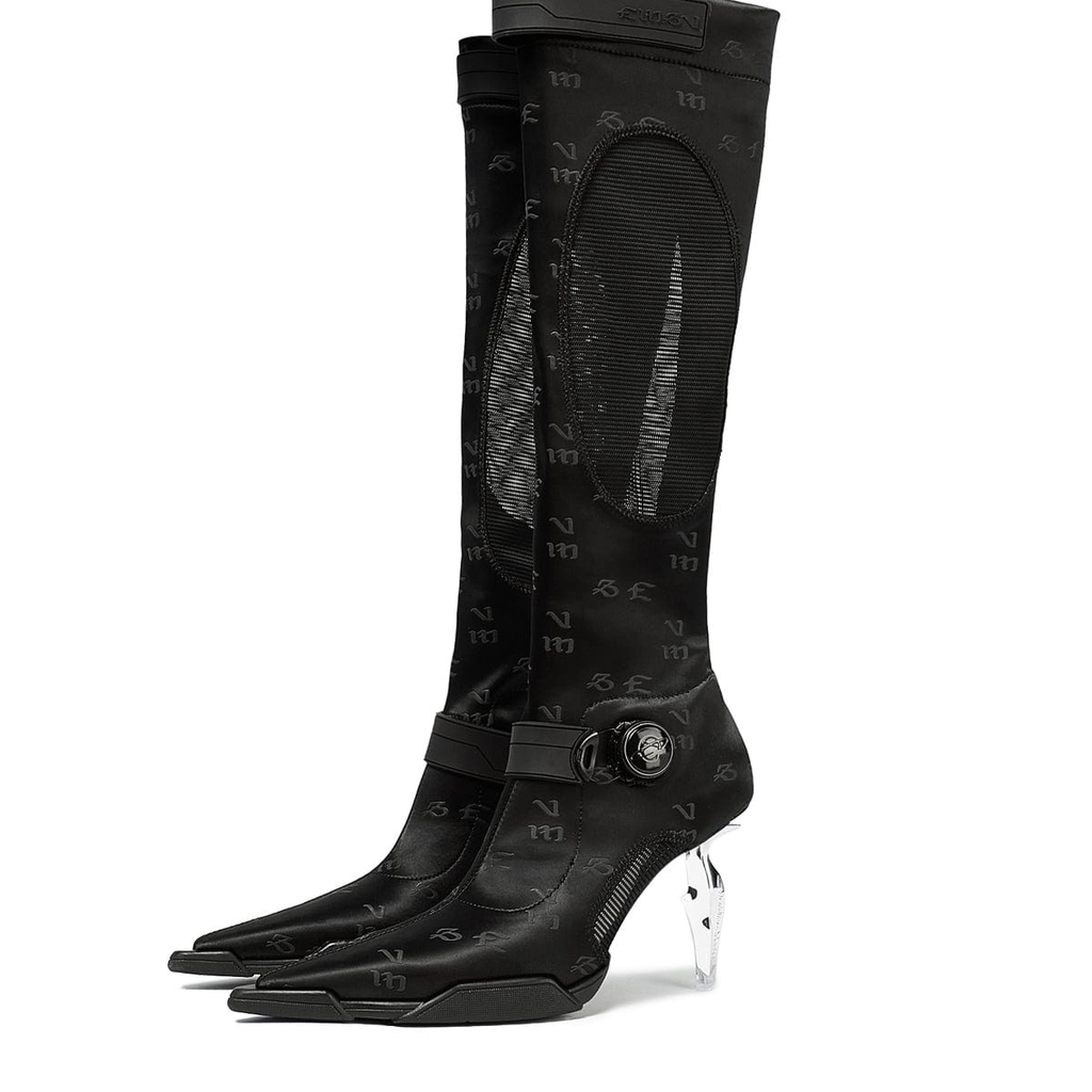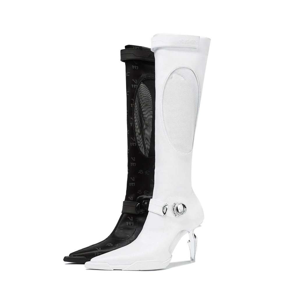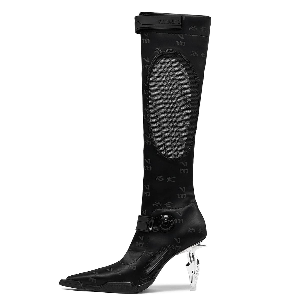 Materials: Stretch Lycra, mesh, Leather sole, Metal heel (dagger heel)