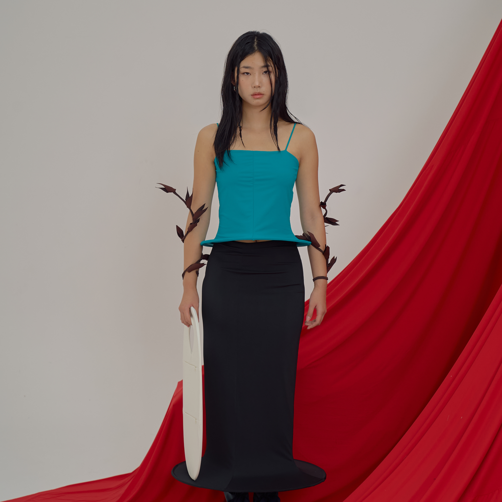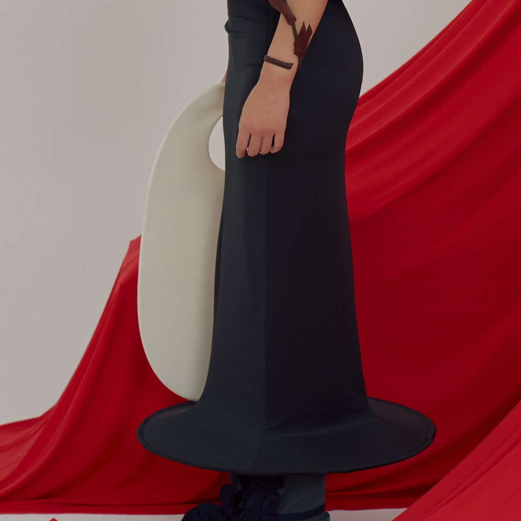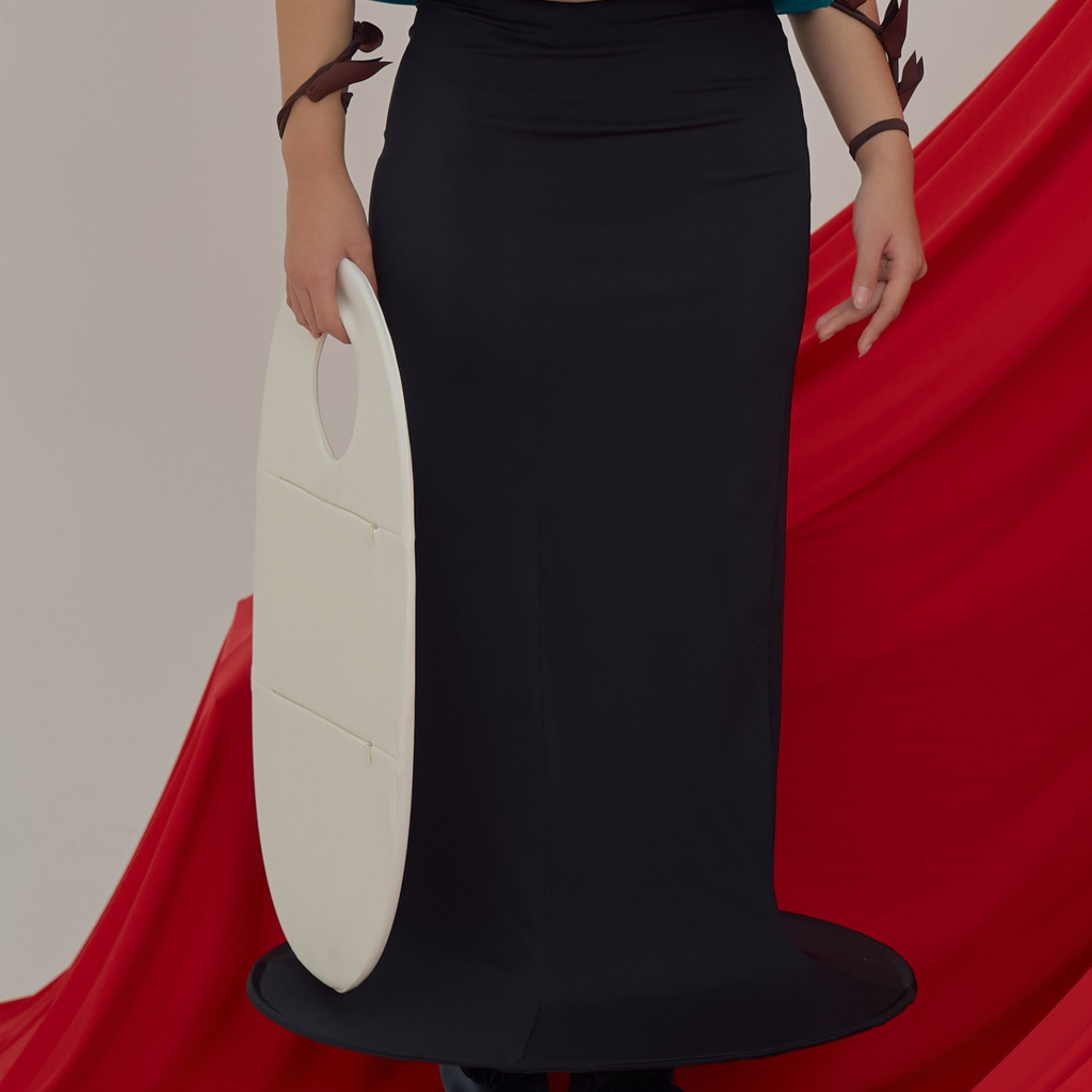 TAMA full length skirt in Black. Stretch nylon jersey fabric. Activewear waistband detail. Steel wire inserted at the hem.