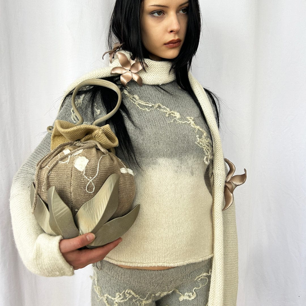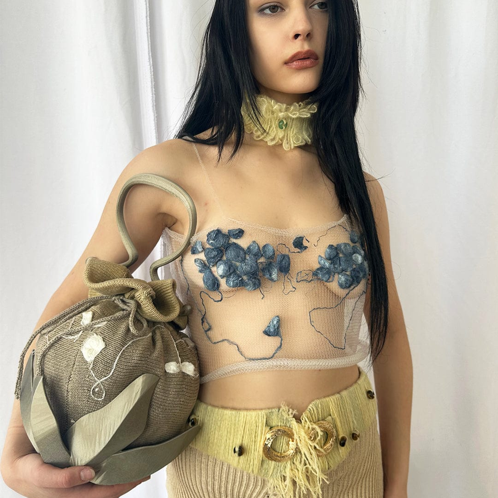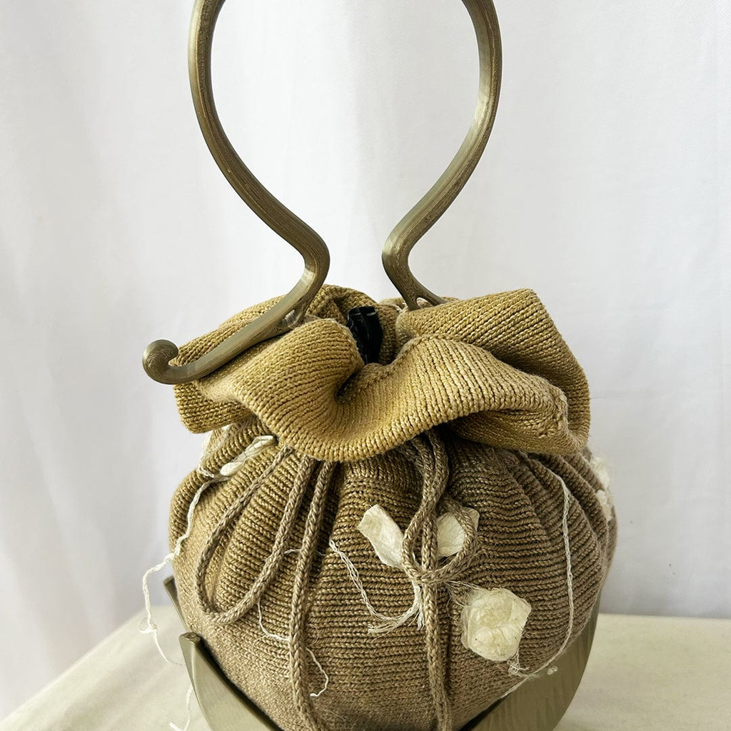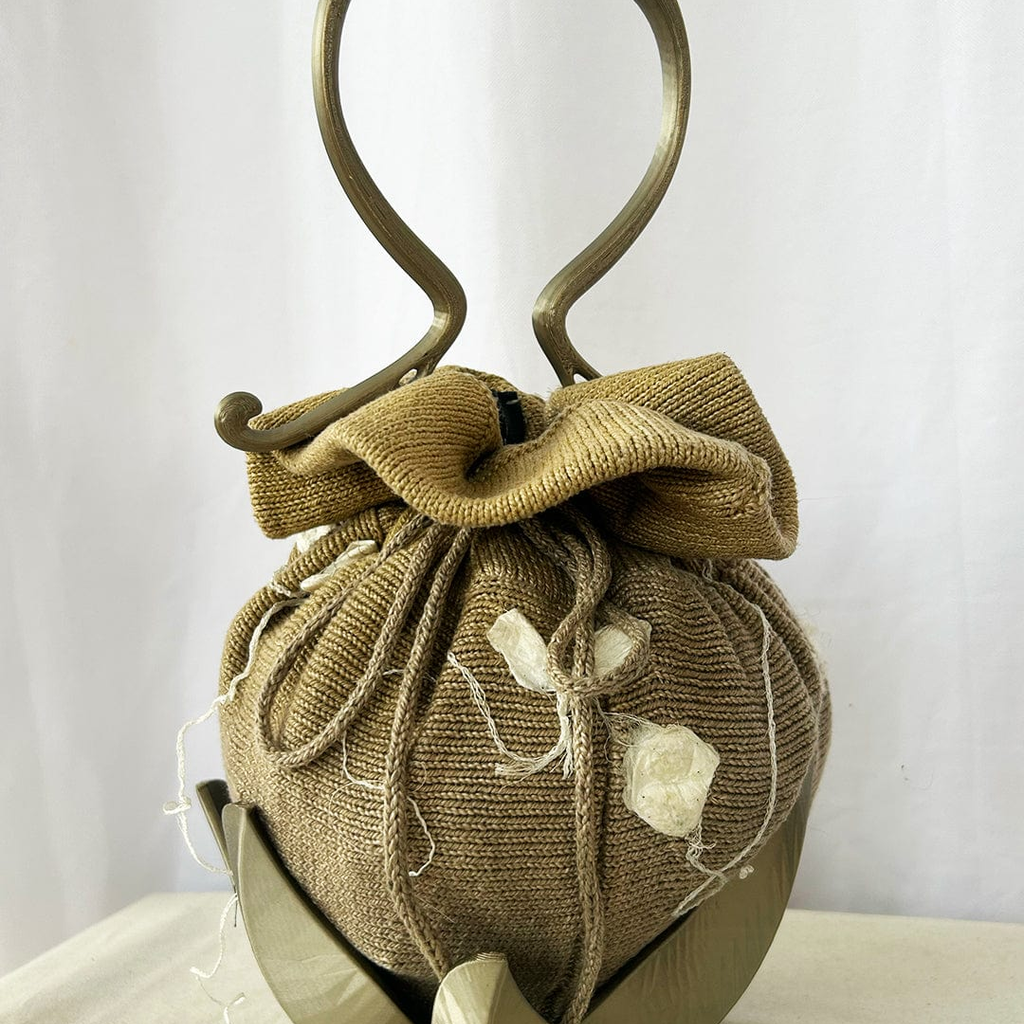 This Tan Laurel Pouch bags are knit with 100% cotton yarn from Eugene, OR, and naturally dyed with Bengala Mud Dye sourced locally in NYC. The surface is finished with naturally dyed embroidered silk cocoons raised in the GRACE GUI studio. The base and handle are 3D printed in Los Angeles, CA, with biodegradable PLA made from sugarcane and cornstarch.