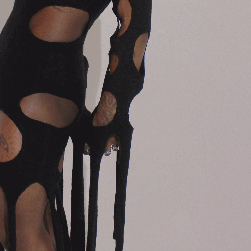 Textiles and tactics find new harmonies through the work of Jules Bramley, replicating natural uniqueness and earthly splendour. This capsule is an exploration into rebirth and transformation. Featuring organic textures, deconstructed shapes, drapery and asymmetrical features. 100% wool fabric is manipulated through deconstructing, felting and sewing with some pieces dipped and coated in natural rubber latex.
