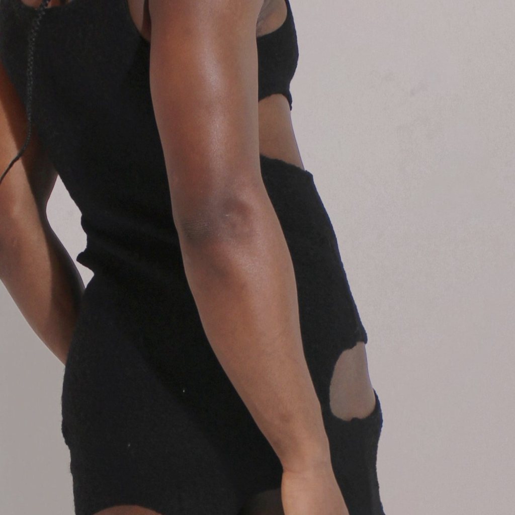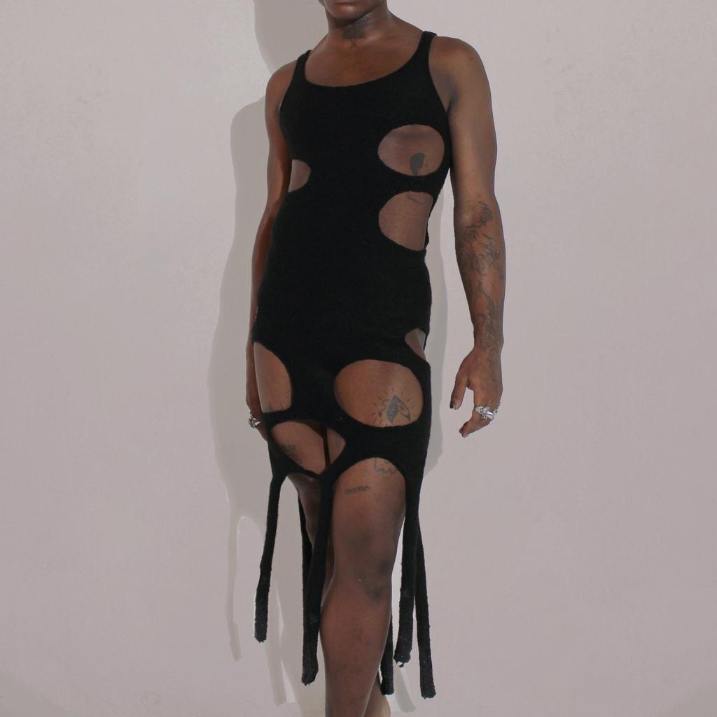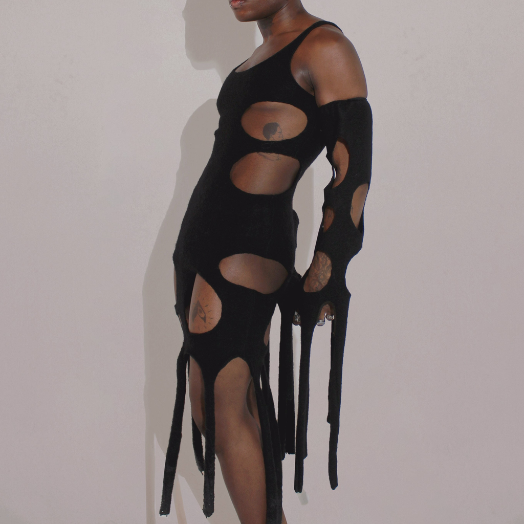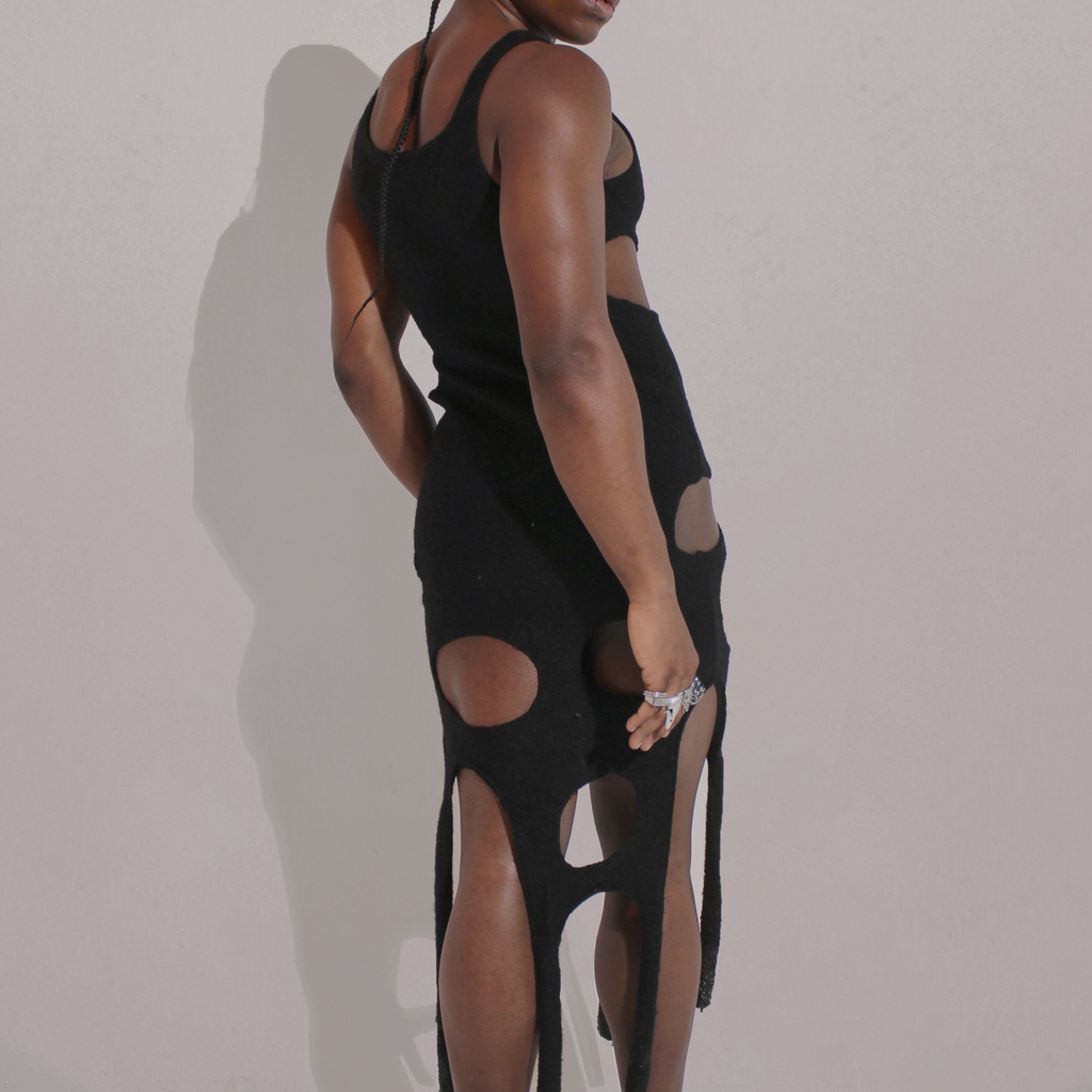 Textiles and tactics find new harmonies through the work of Jules Bramley, replicating natural uniqueness and earthly splendour. This capsule is an exploration into rebirth and transformation. Featuring organic textures, deconstructed shapes, drapery and asymmetrical features. 100% wool fabric is manipulated through deconstructing, felting and sewing with some pieces dipped and coated in natural rubber latex.