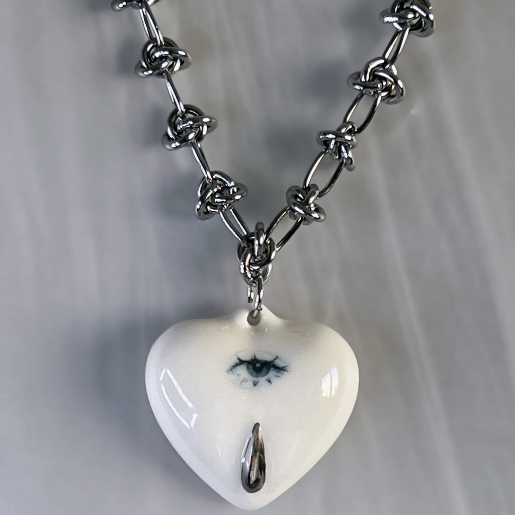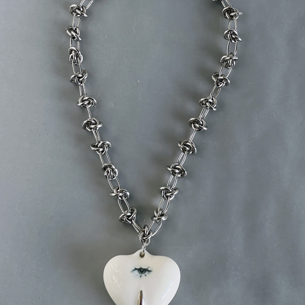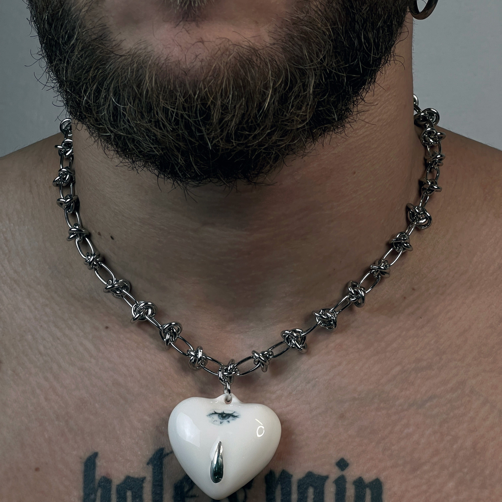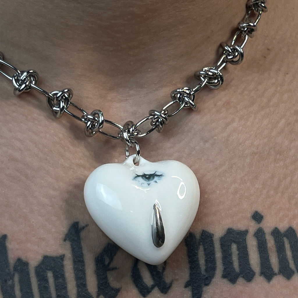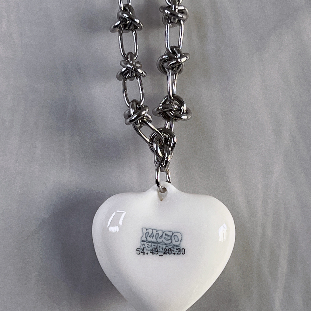 The glazed white porcelain heart pendant is adorned with platinum and ceramic decals. Stainless steel knot chain. The design applied to the porcelain is an original tattoo sketch by the artist 54.43_20.30. The print and platinum elements are applied using special ceramic compositions that are fired at 800 degrees, ensuring high wear resistance.