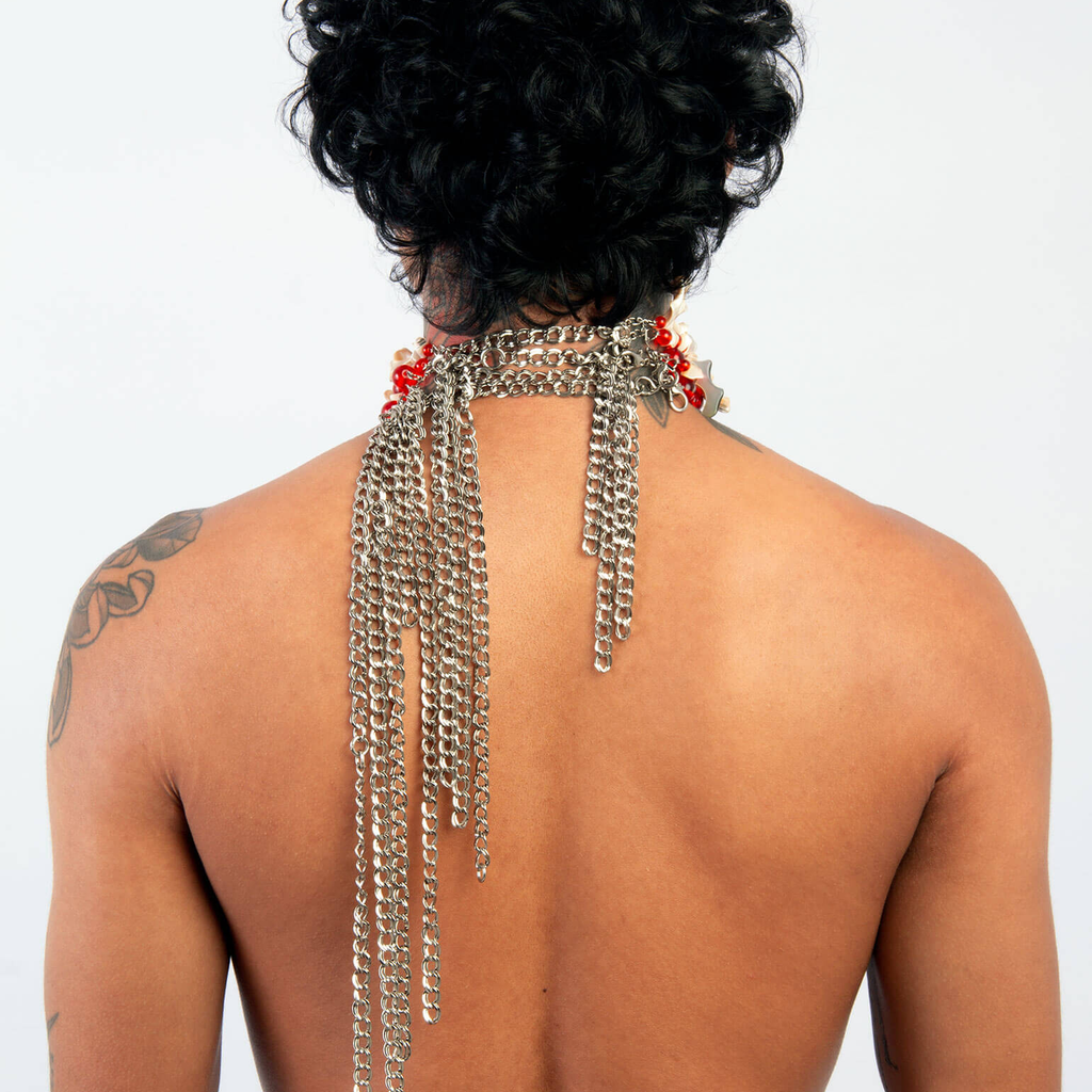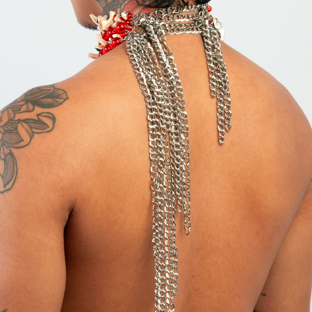 Jalaconda is a multidisciplinary artistic project, focused on the body. The LGBTQIA+ brand researches unconventional materials, such as latex, steel and natural Brazilian stones. They aim to discuss the place of manual work and personal adornment, knowing that clothes are fully political as they are from a country historically full of complexities.