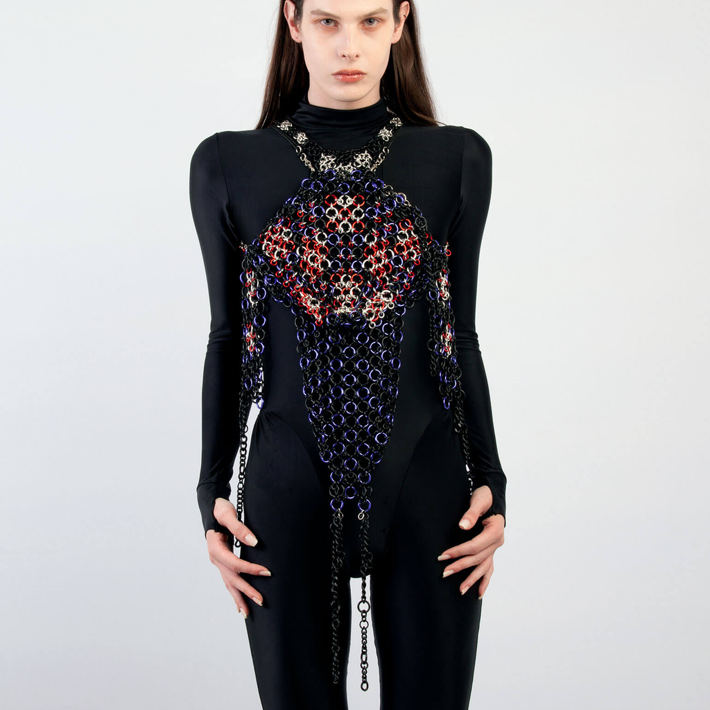 Jalaconda is a multidisciplinary artistic project, focused on the body. The LGBTQIA+ brand researches unconventional materials, such as latex, steel and natural Brazilian stones. They aim to discuss the place of manual work and personal adornment, knowing that clothes are fully political as they are from a country historically full of complexities.