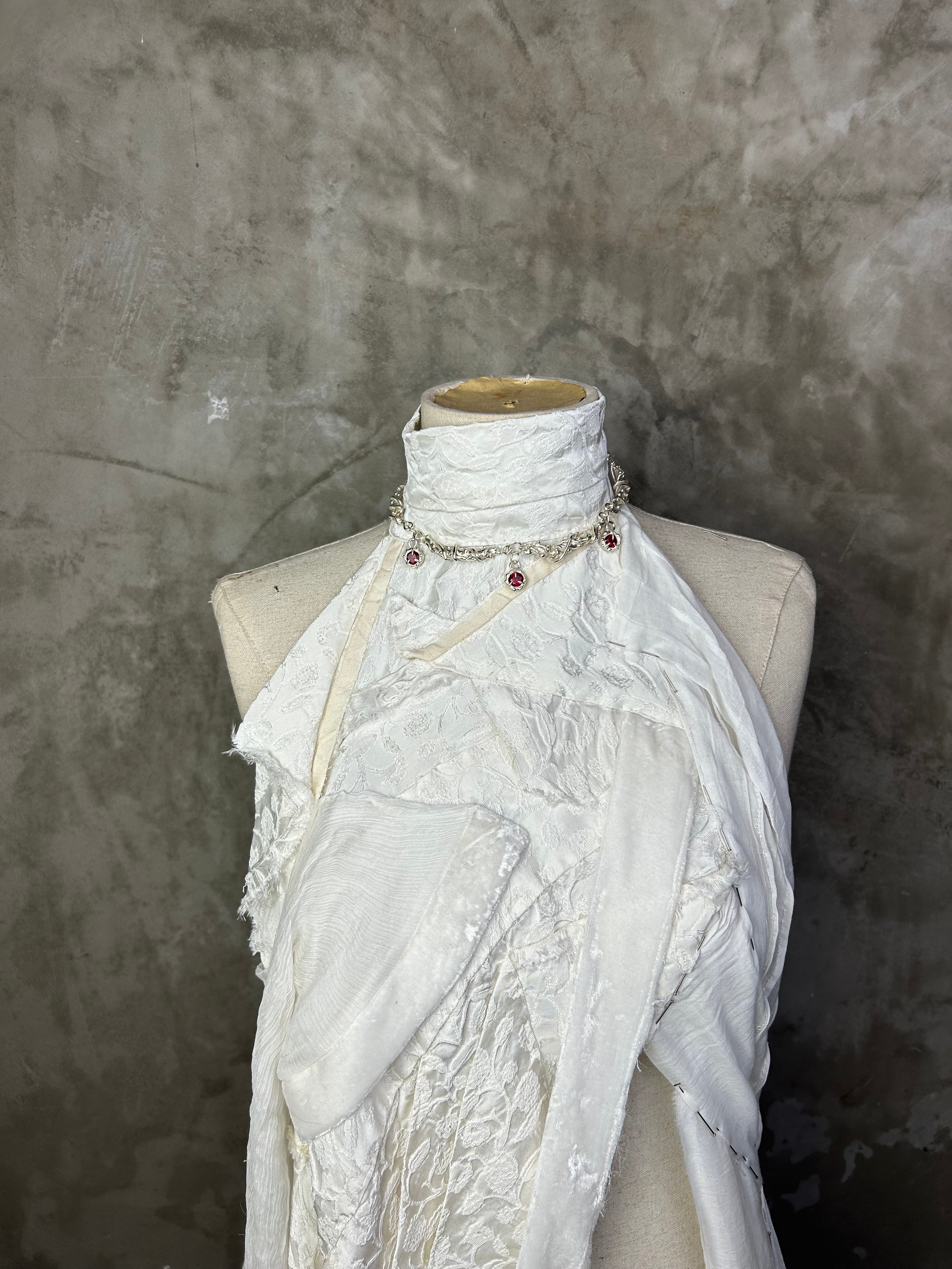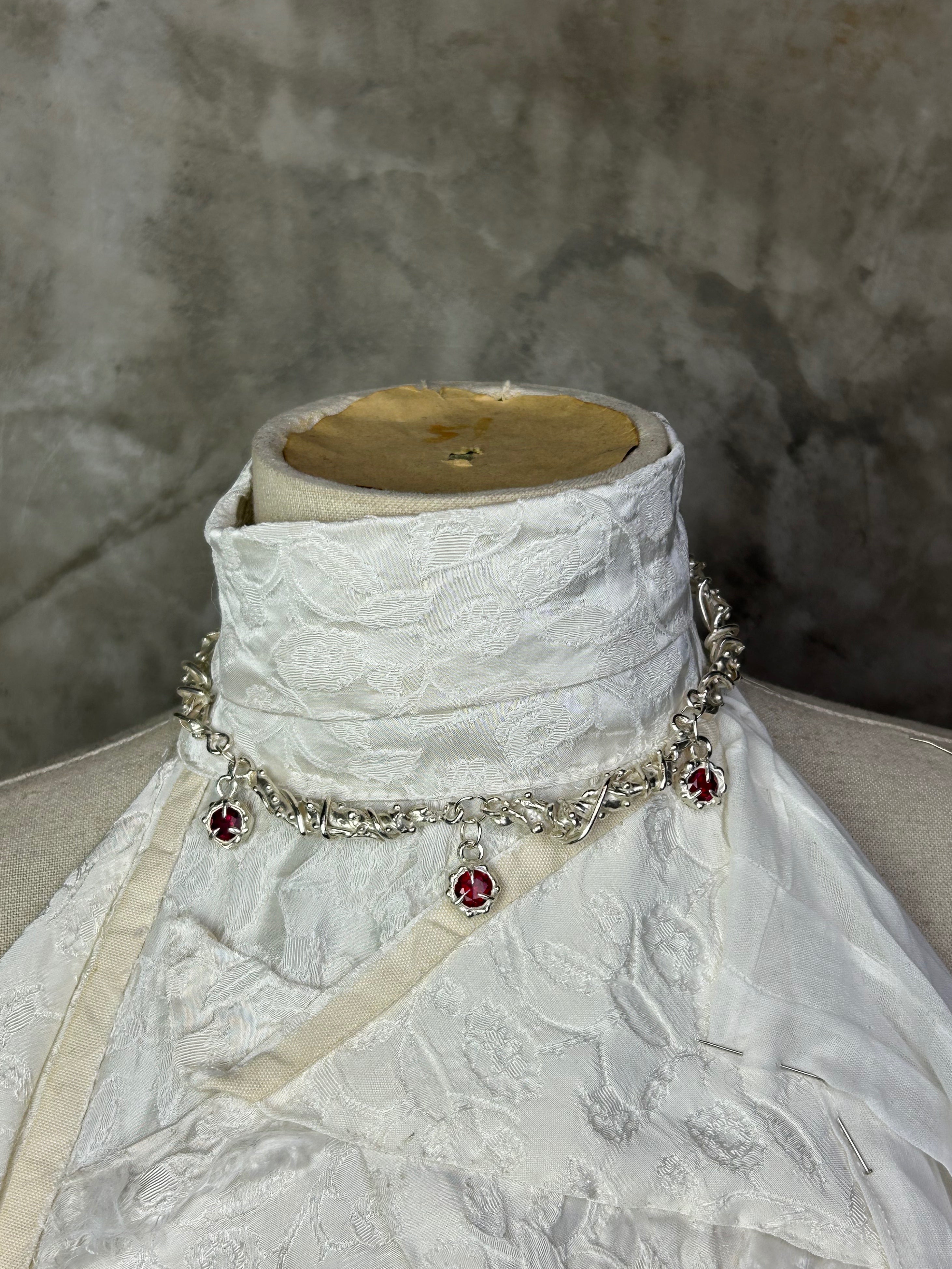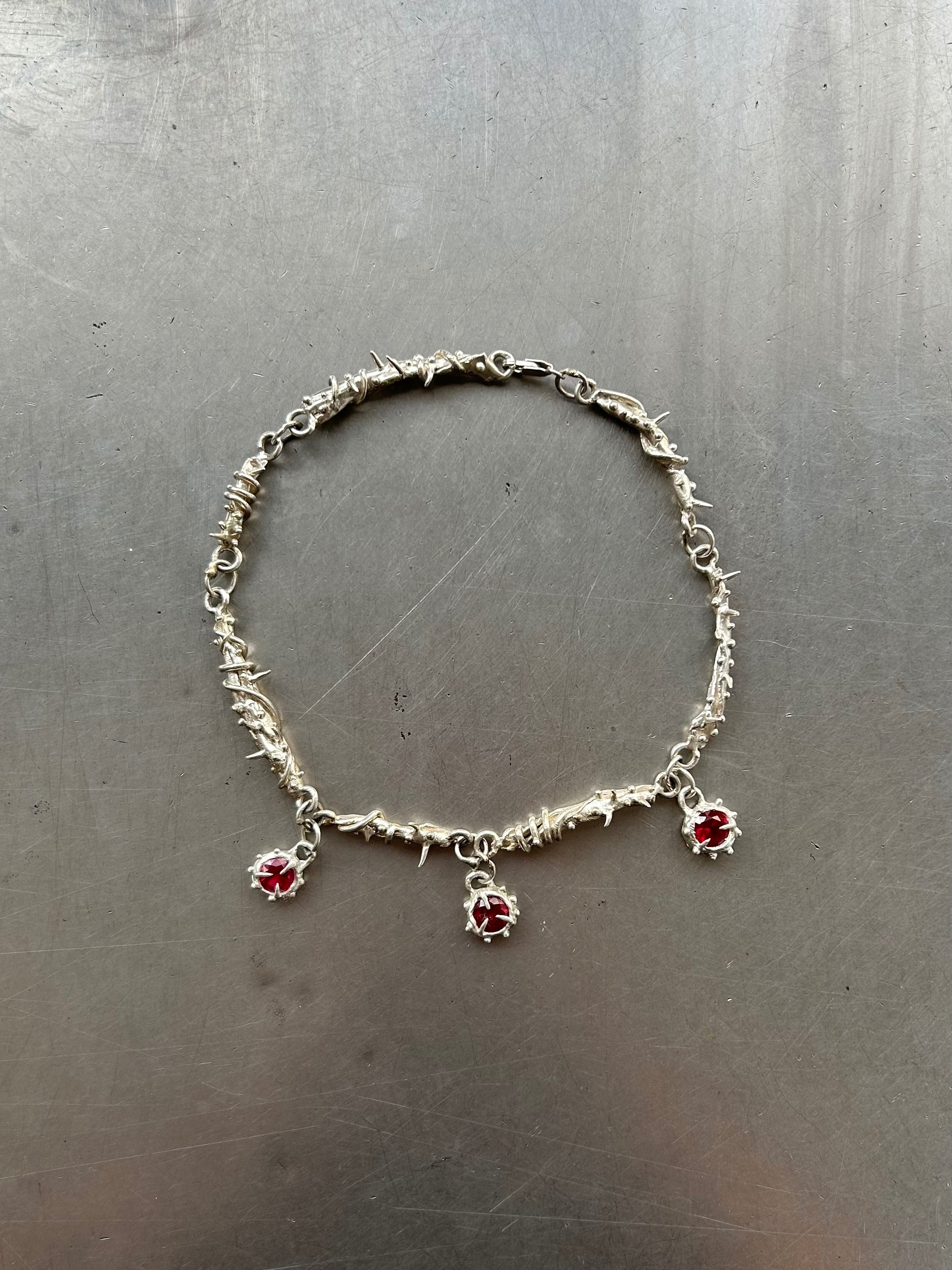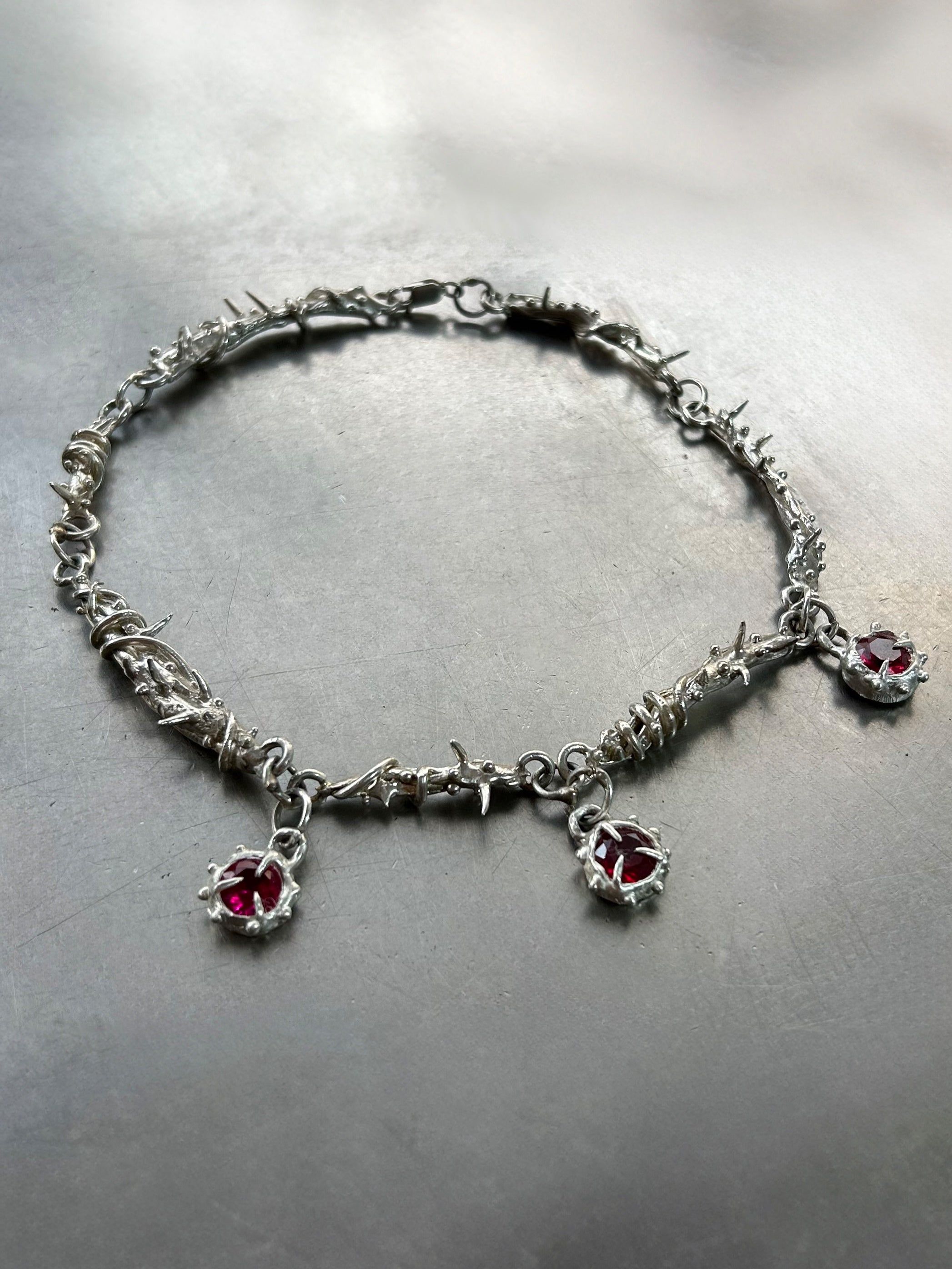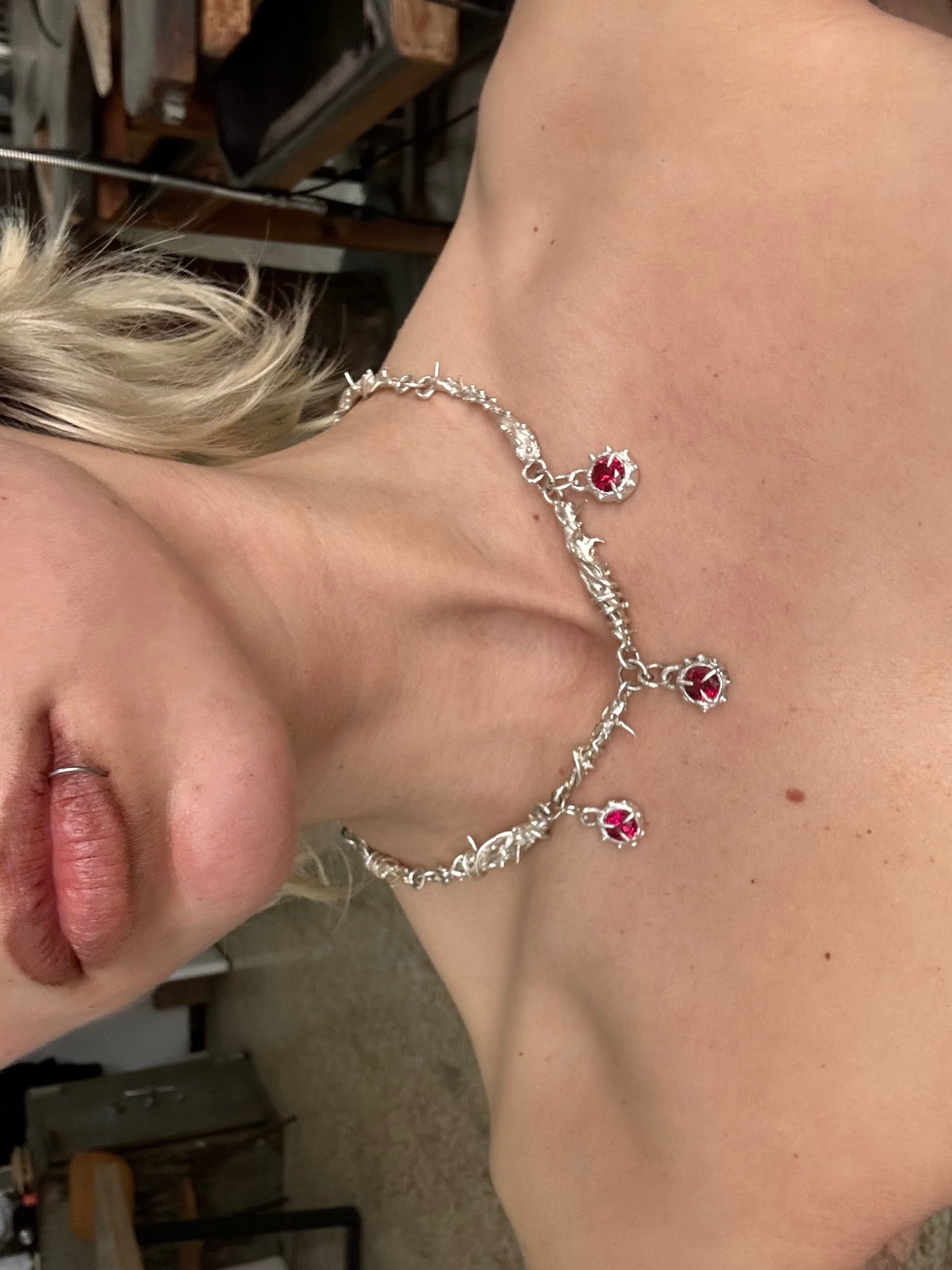 Hand-crafted choker, fully cast in 925 silver. Each element was sculpted by hand, shaped into spikes and spheres, inspired by rose gardens and nature cloaked in thorns. The three rubies that hang from the piece bloom like roses rising from the brambles, fierce, delicate, and alive.