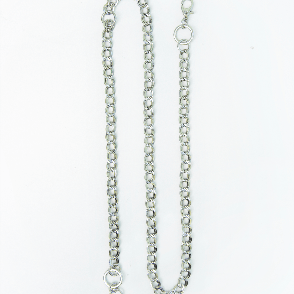 One size, adjustable. It comes with different extensions and can be used as a choker, a necklace, a body chain or a bag accessory.
