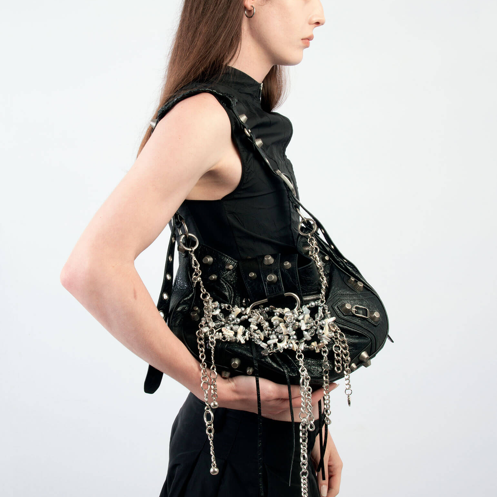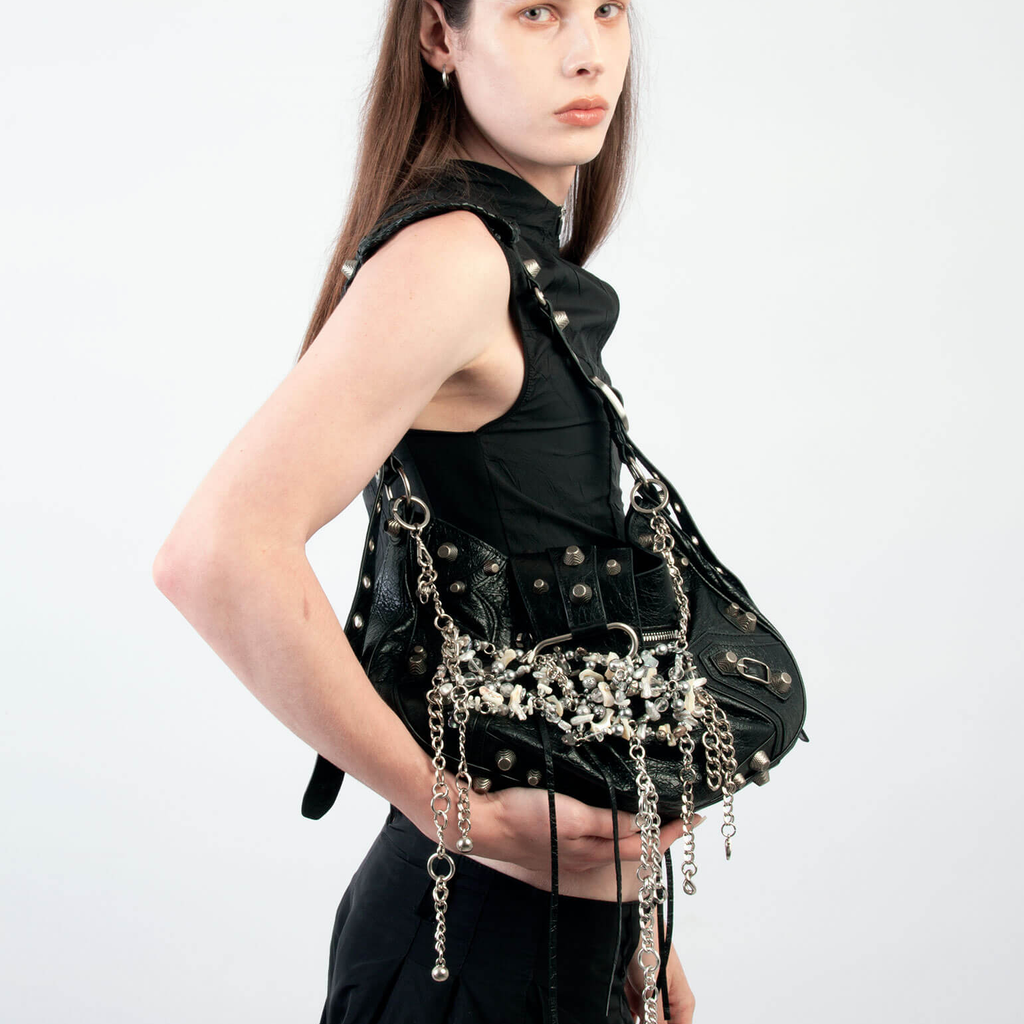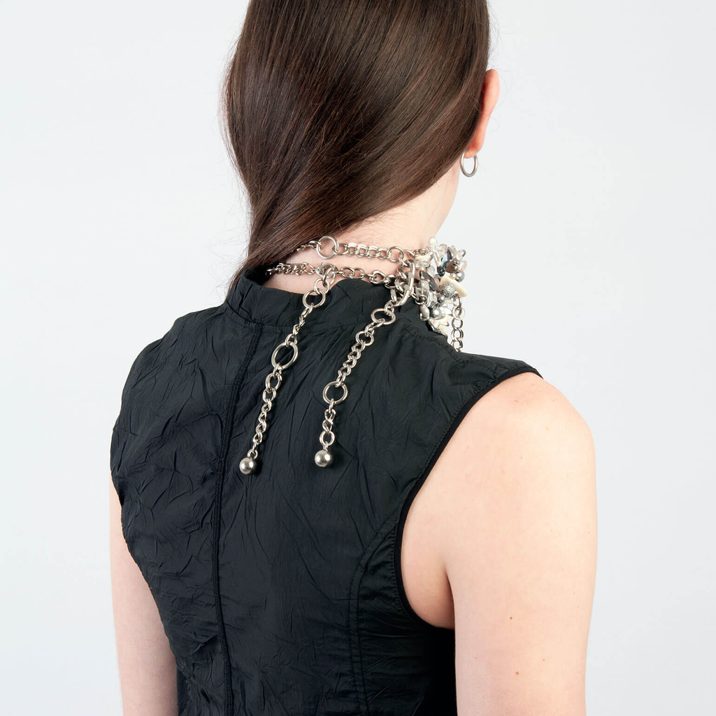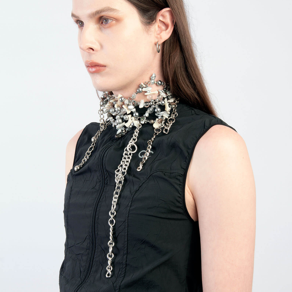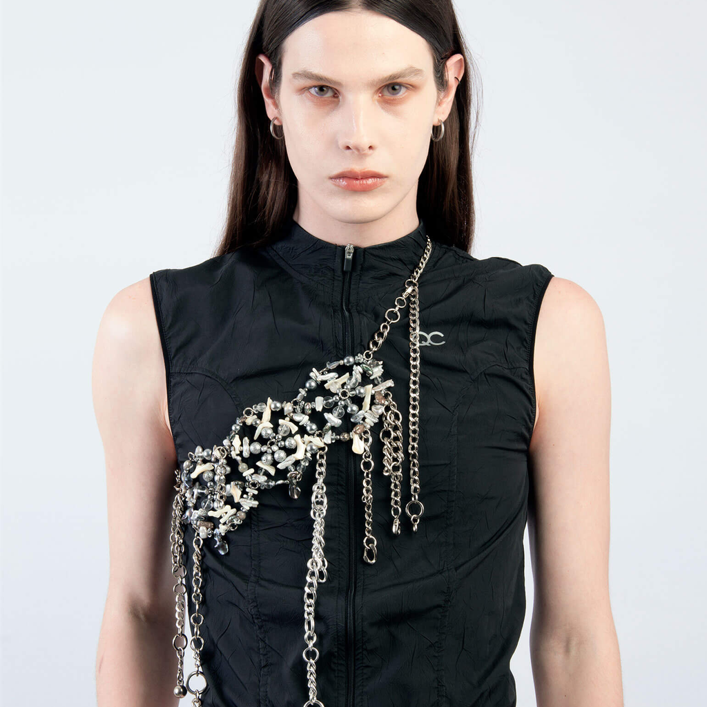 Jalaconda is a multidisciplinary artistic project, focused on the body. The LGBTQIA+ brand researches unconventional materials, such as latex, steel and natural Brazilian stones. They aim to discuss the place of manual work and personal adornment, knowing that clothes are fully political as they are from a country historically full of complexities.