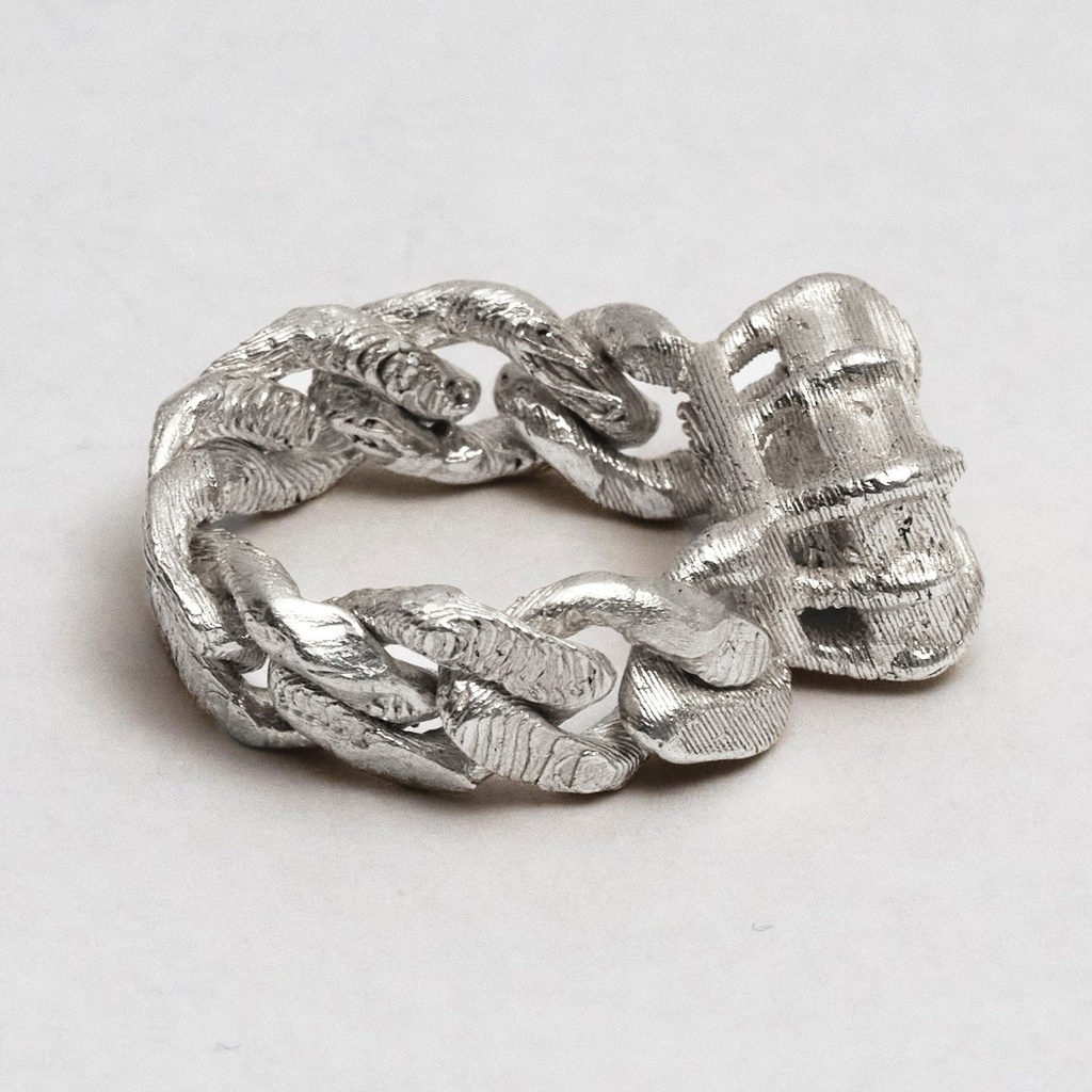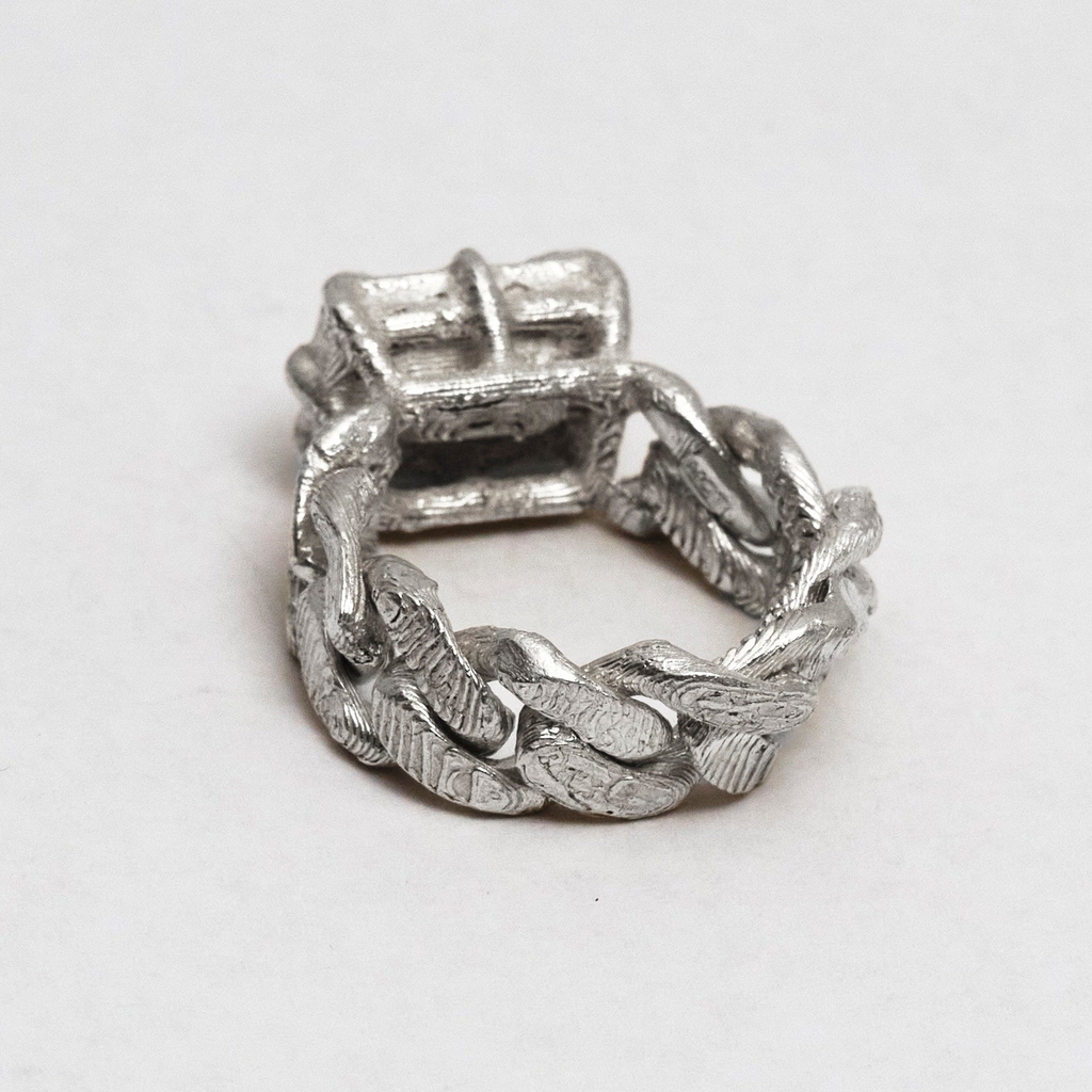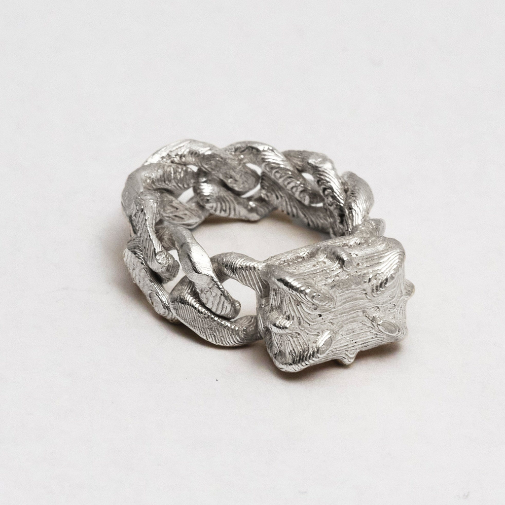 Big solid silver stone laced into a cuban chain. Features unique topography textures. Each handmade and unique. Available in solid or loose-link chain styles.
