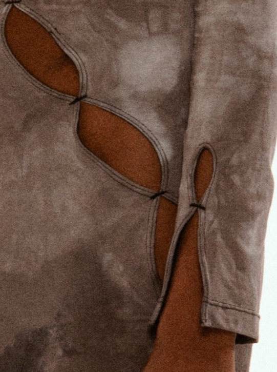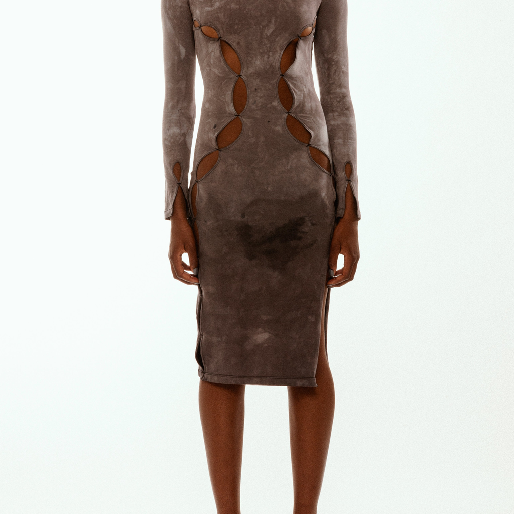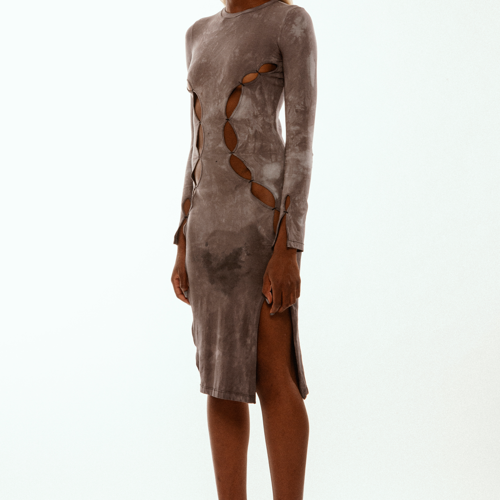 Mesh long sleeve floor length dress with cutout detail.