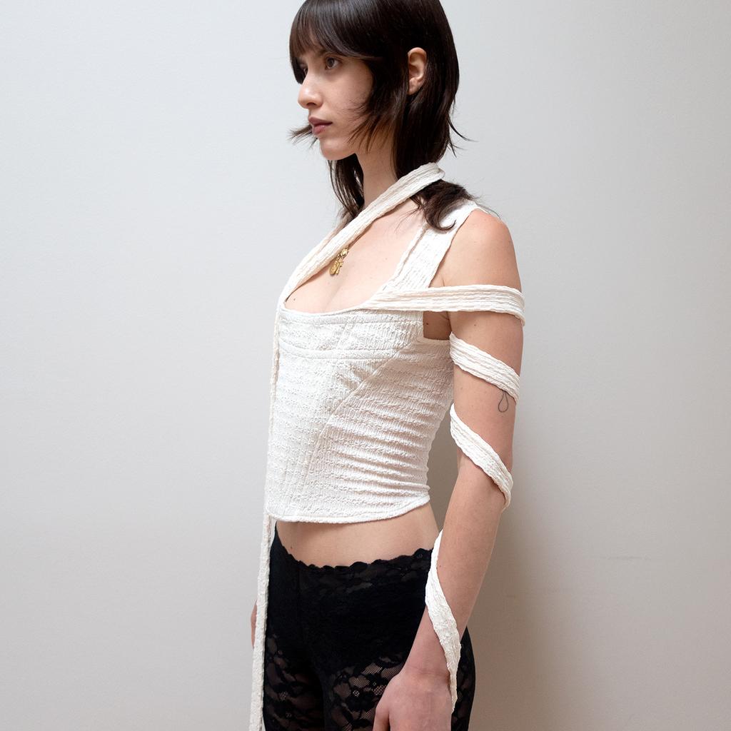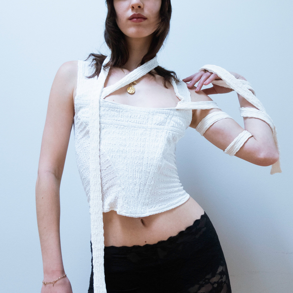 Fully boned, textured jersey corset with jersey wrap around ties, can be styled in multiple ways.