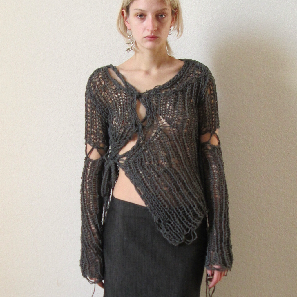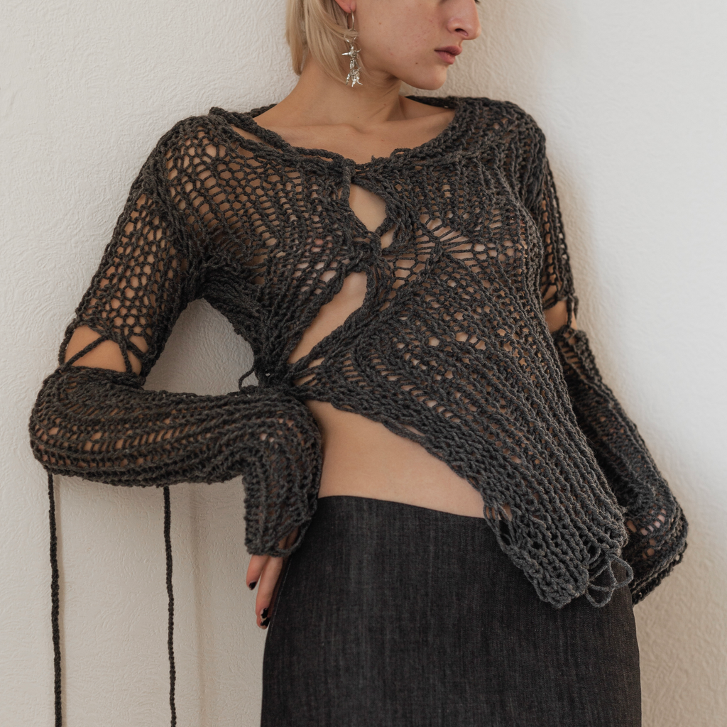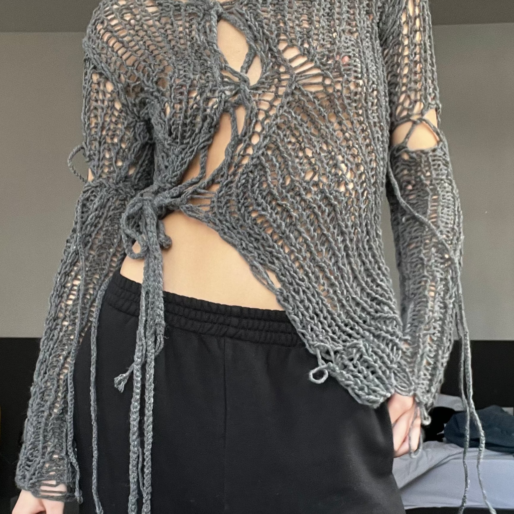 Asymmetric knitted top with elasticated ties, size and number of elasticated ties can be adjusted.
