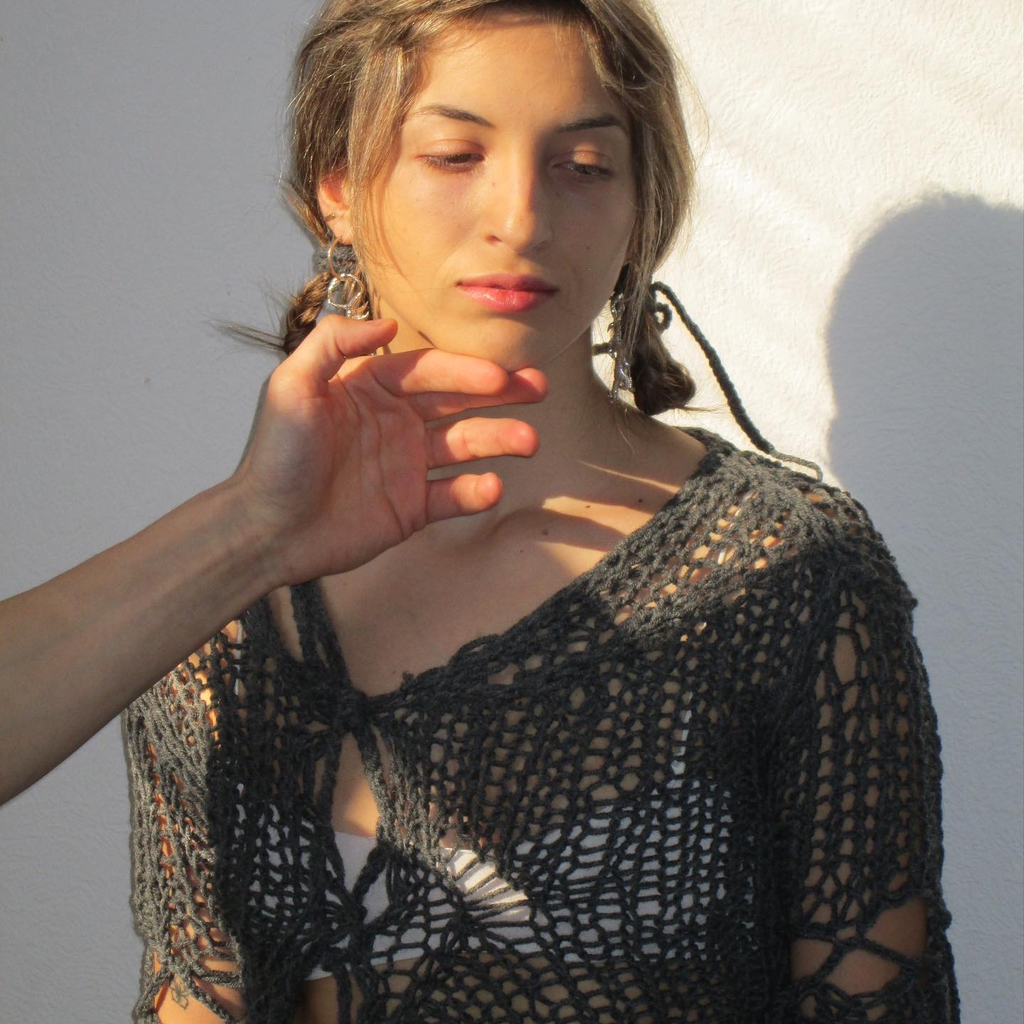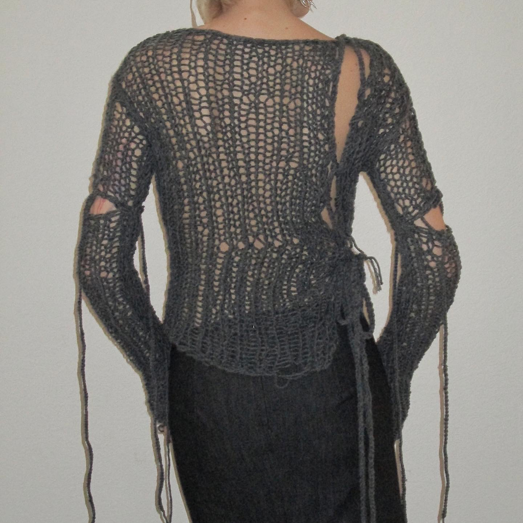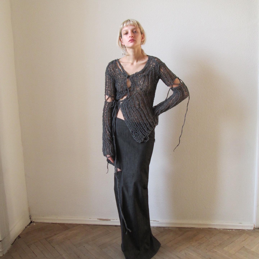 Asymmetric knitted top with elasticated ties, size and number of elasticated ties can be adjusted.