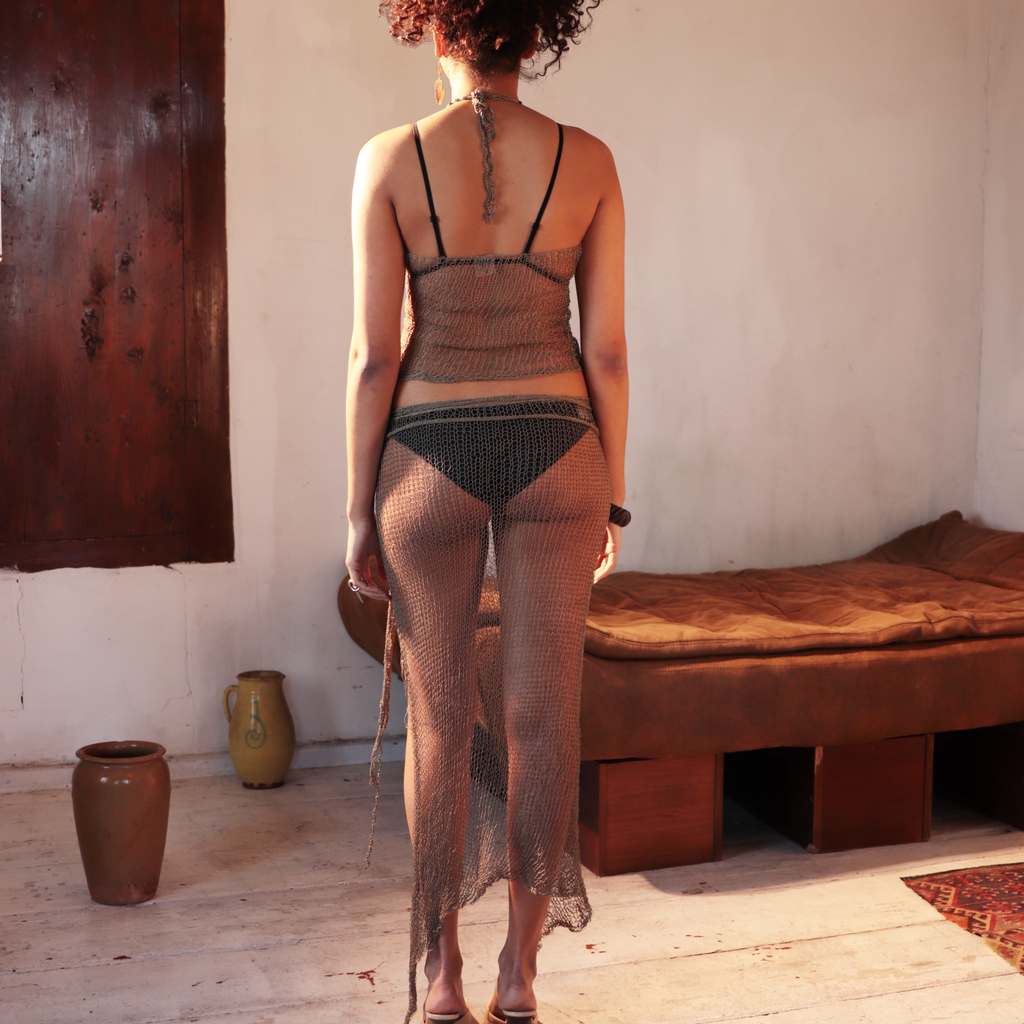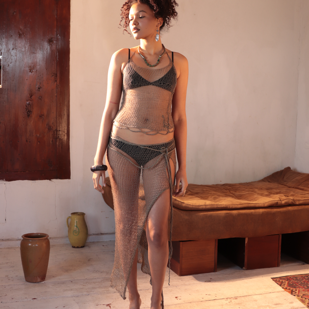 The skirt has different types of ties that allow you to fix it on your hips or other parts of your body in different ways. The length and width depend on the tension of Pareo on a body. The piece can stretch and take different shapes depending on how you fix it on your body.
