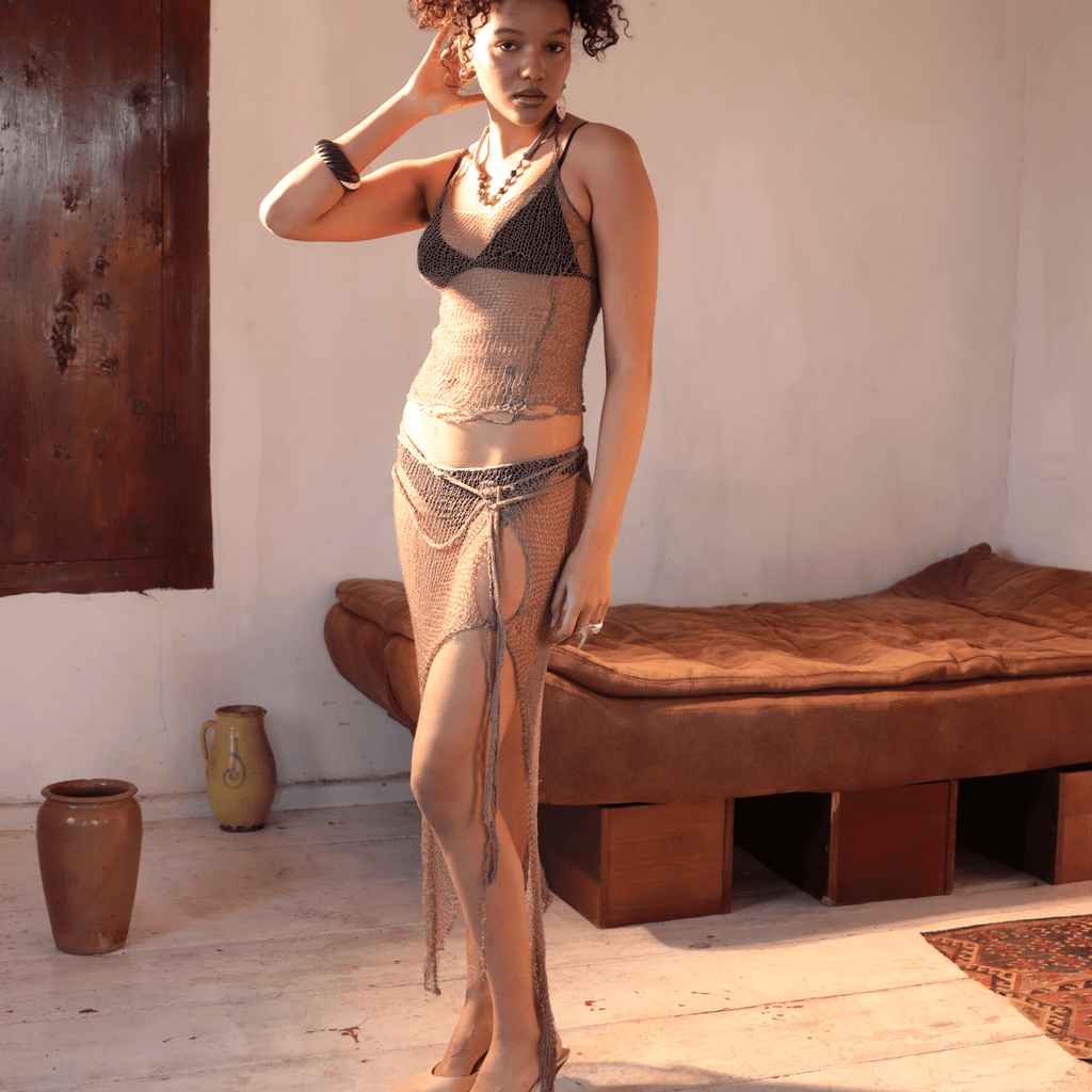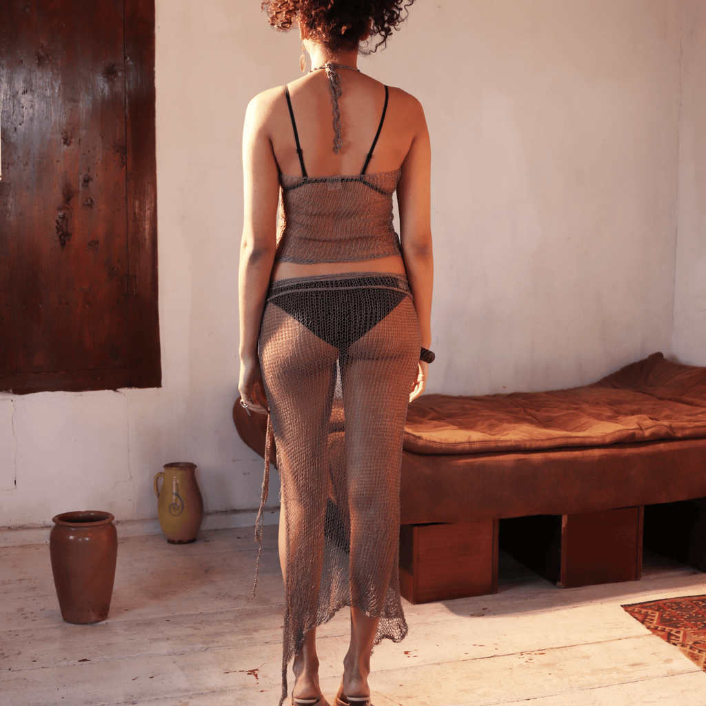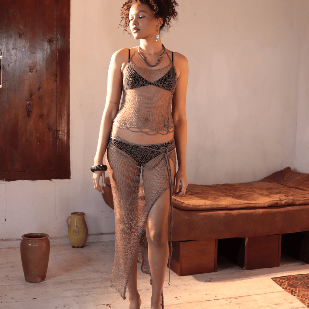 Can be ordered as a set or individual pieces. Top with the asymmetric bottom line. Easily stretches. Neck part has ties that allow you to adjust the height and width of the throat. The skirt has different types of ties that allow you to fix it on your hips or other parts of your body in different ways. The length and width depend on the tension of Pareo on a body. The piece can stretch and take different shapes depending on how you fix it on your body. 100% Mercerized Cotton. Thin smooth strong thread. Comfortable for any season. Can get wet. Wear it with a swimming suit or with other basic tops / longsleeves. * Tight fit if you take your regular size, for loose fit take a bigger size