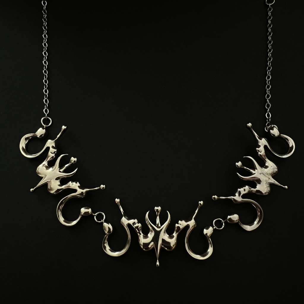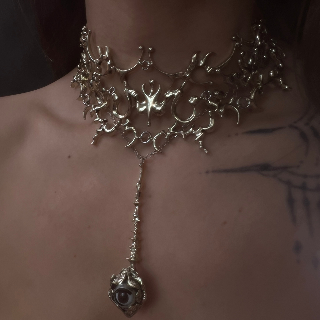 Kt Ferris’ New York City-based label, This Shit Blinks, merges handcrafted ancient symbolism with liquid futurism. Drawing inspiration from centuries-old symbols and motifs, she infuses these ancient elements and techniques in new ways, creating an enchanting fusion of past and current. Each piece is hand-crafted by Kt.