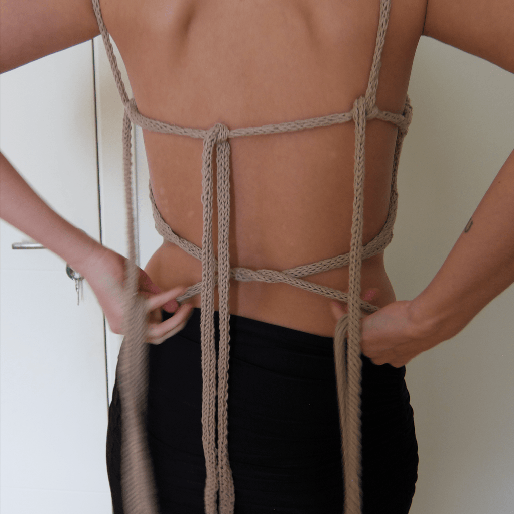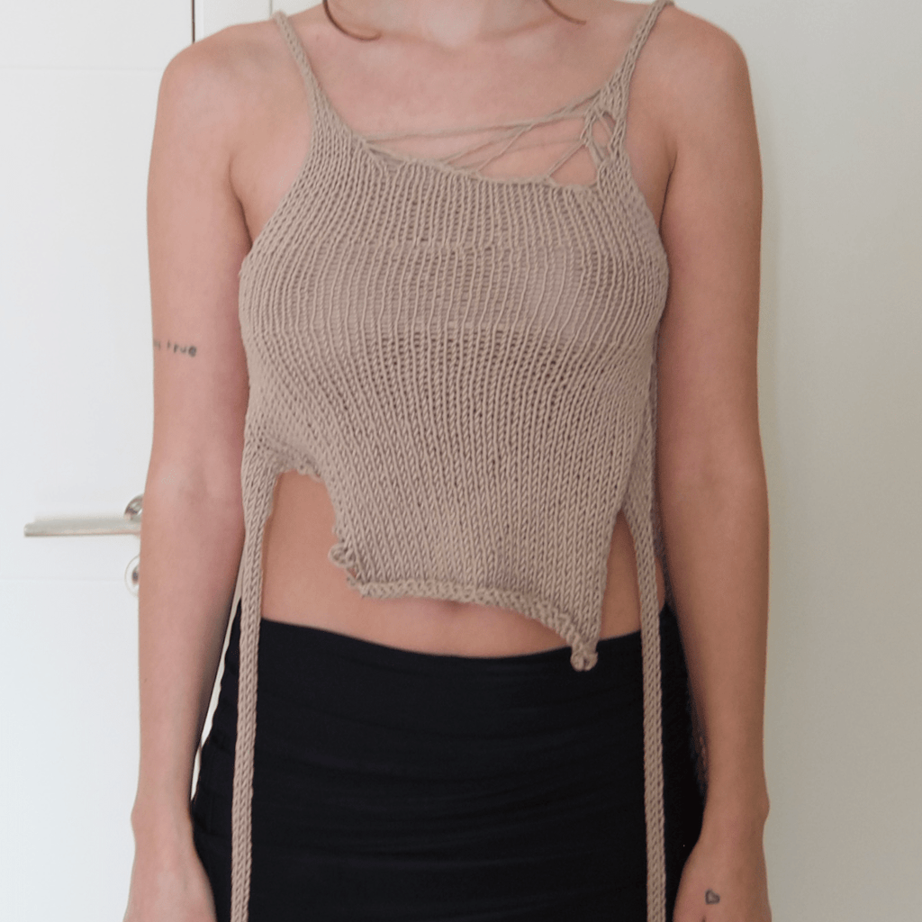 Top with asymmetric bottom line. Easily stretches. Open back with long ties.