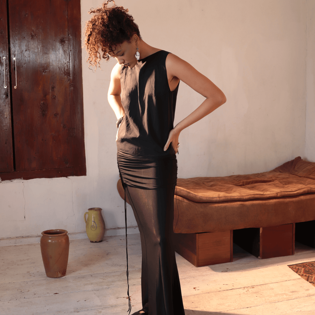 Top from matte linen classic shape in front and open back with asymmetric tie (tie can be removed)