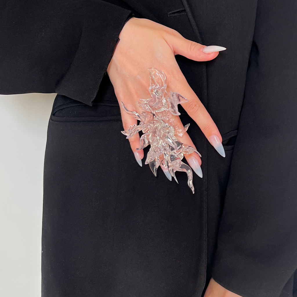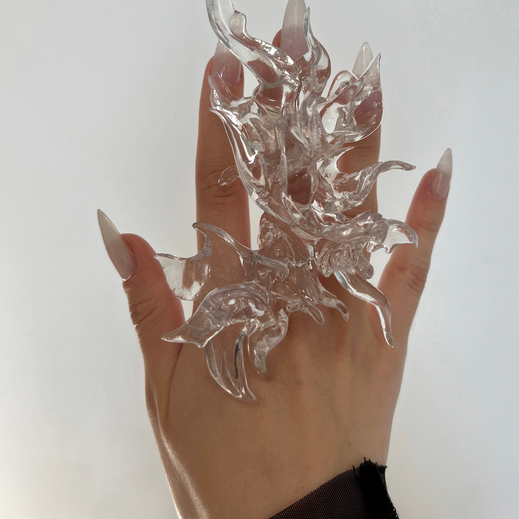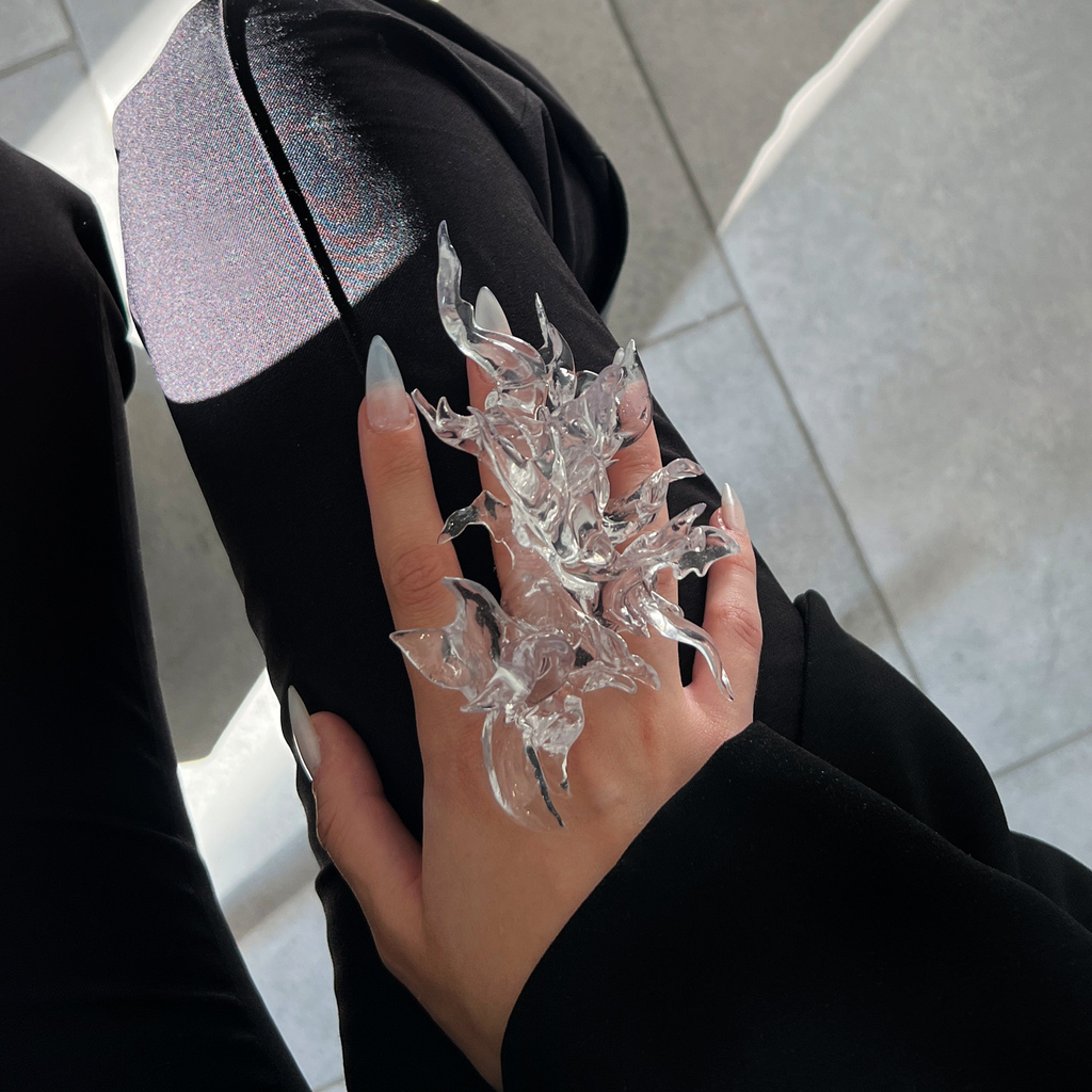 3D-printed transparent ring.The abstract form of the ring, inspired by the intricate structures of coral, gives it a unique and enchanting character. Lines and shapes seem to flow and dance, as if the piece is in constant, gentle motion. This design captures the essence of the underwater realm, where life thrives in a symphony of movement and beauty.