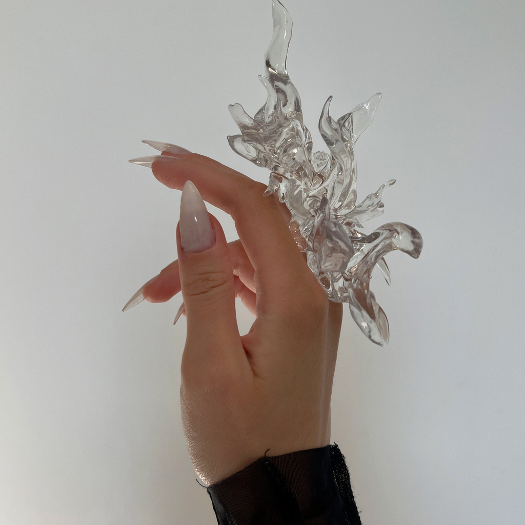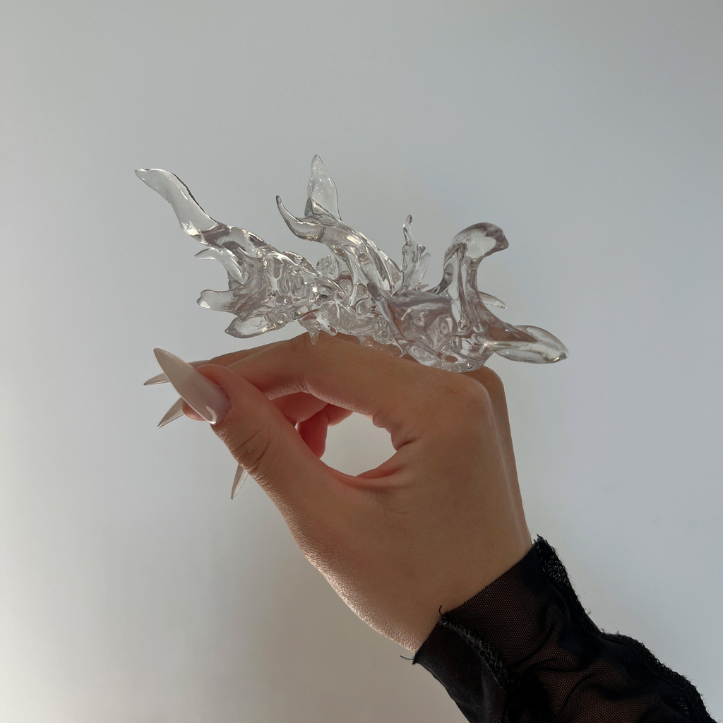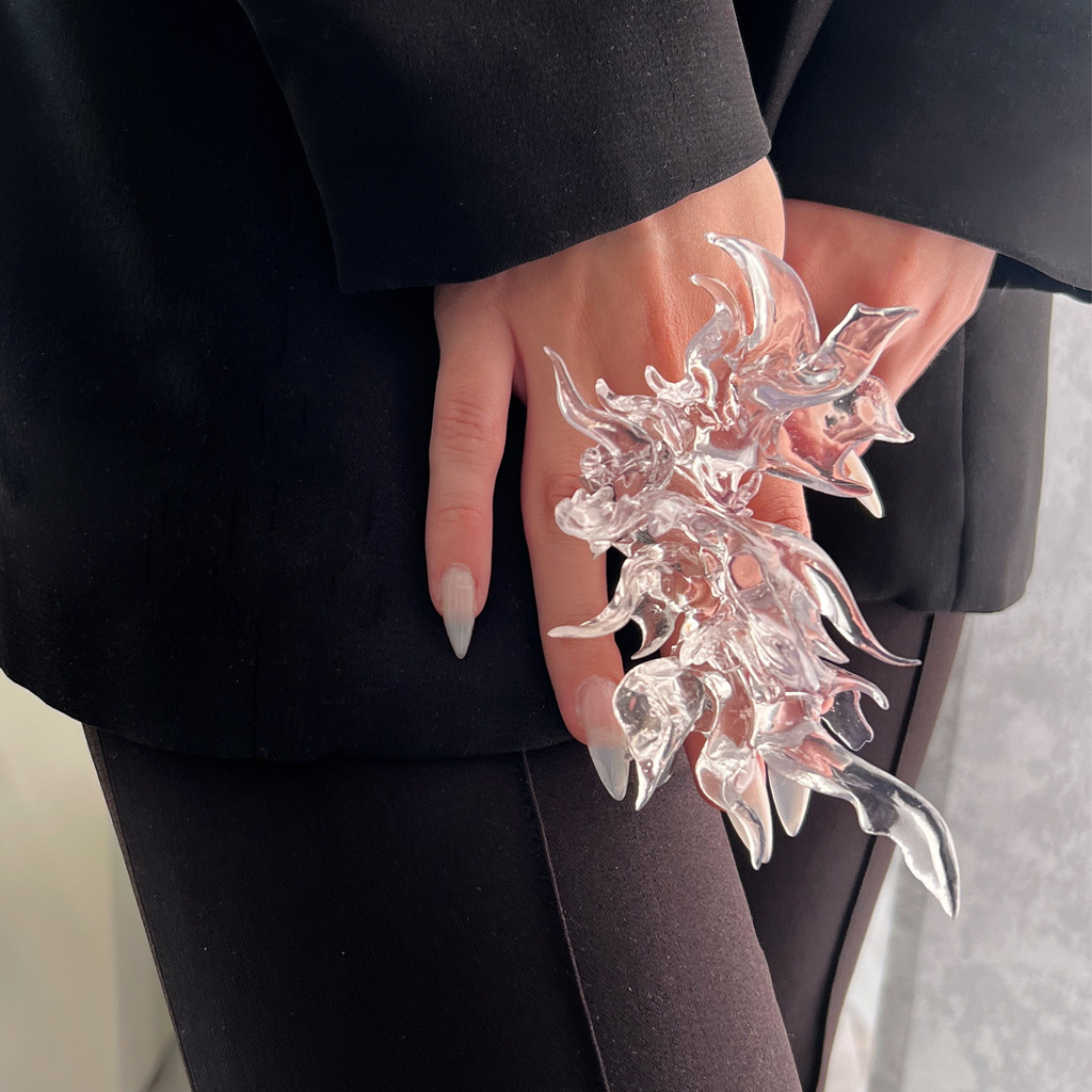 3D-printed transparent ring.The abstract form of the ring, inspired by the intricate structures of coral, gives it a unique and enchanting character. Lines and shapes seem to flow and dance, as if the piece is in constant, gentle motion. This design captures the essence of the underwater realm, where life thrives in a symphony of movement and beauty.
