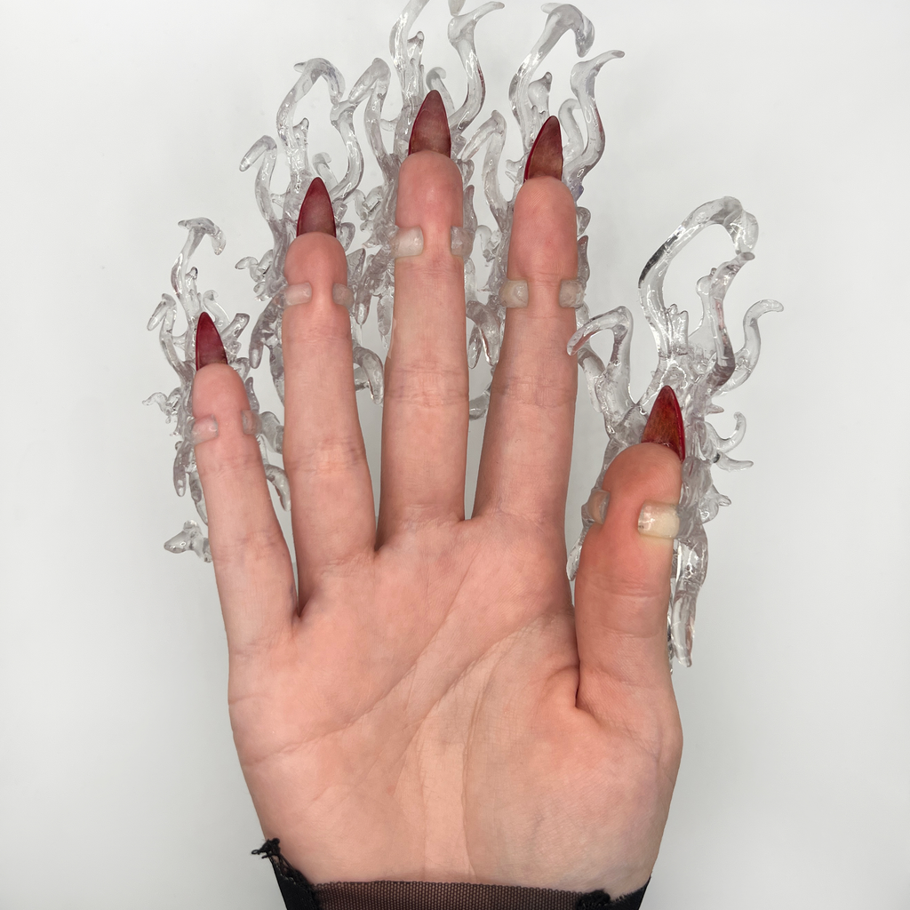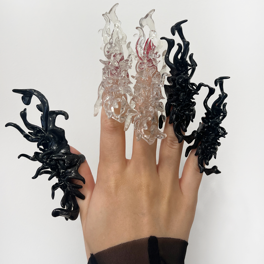 3D-printed organic-shaped ring nails. Each ring is sculpted and finished by hand to achieve a unique design.