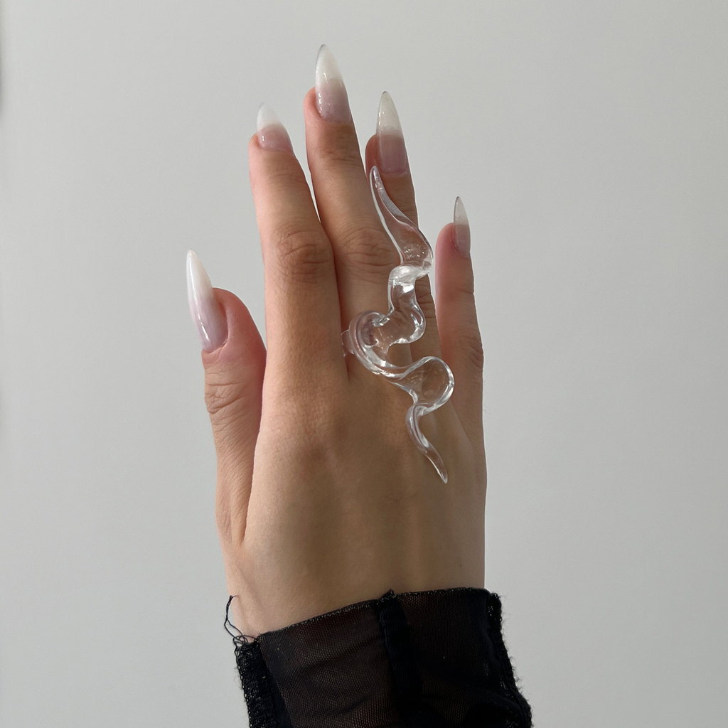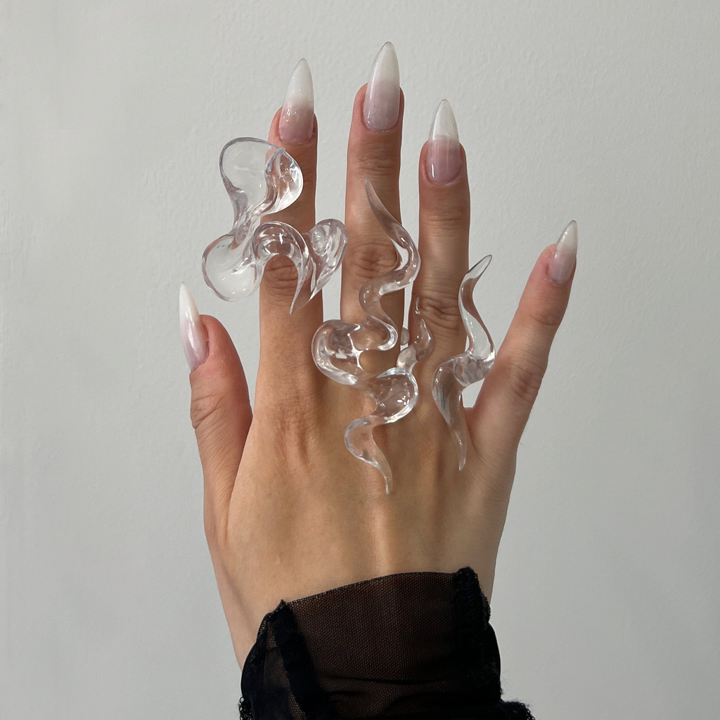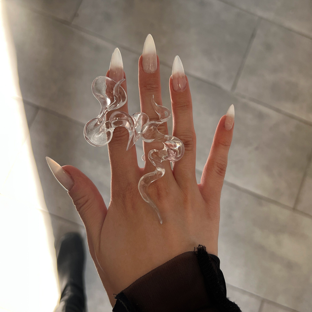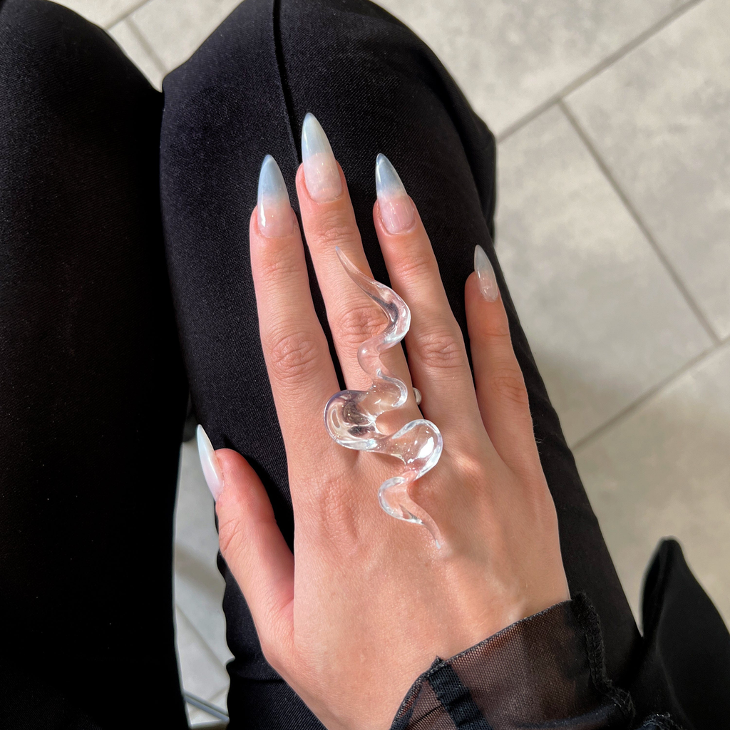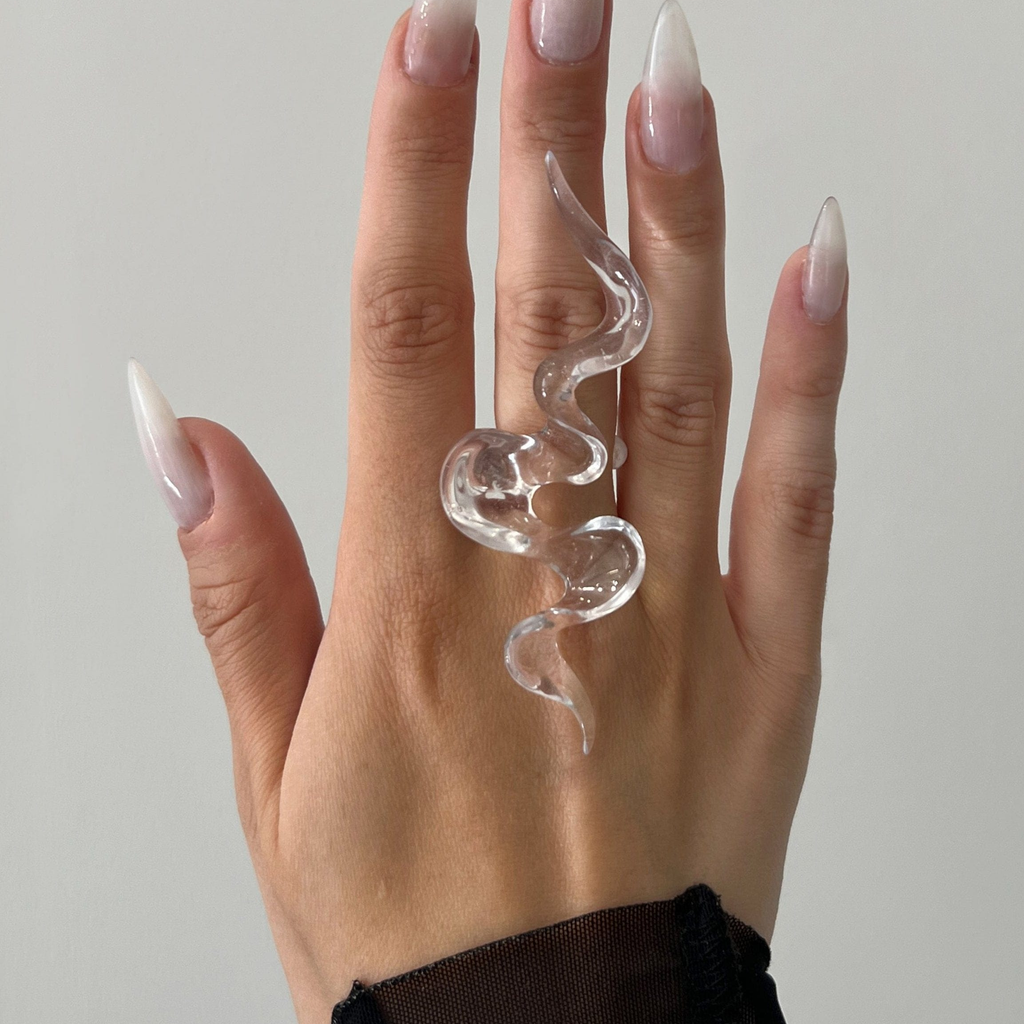 3D-printed transparent ring. Inspired by the organic beauty of nature, this ring has an abstract sculptural design. Each piece is finished by hand to achieve a unique design. You can turn the ring and wear it upside down to achieve a new design.
