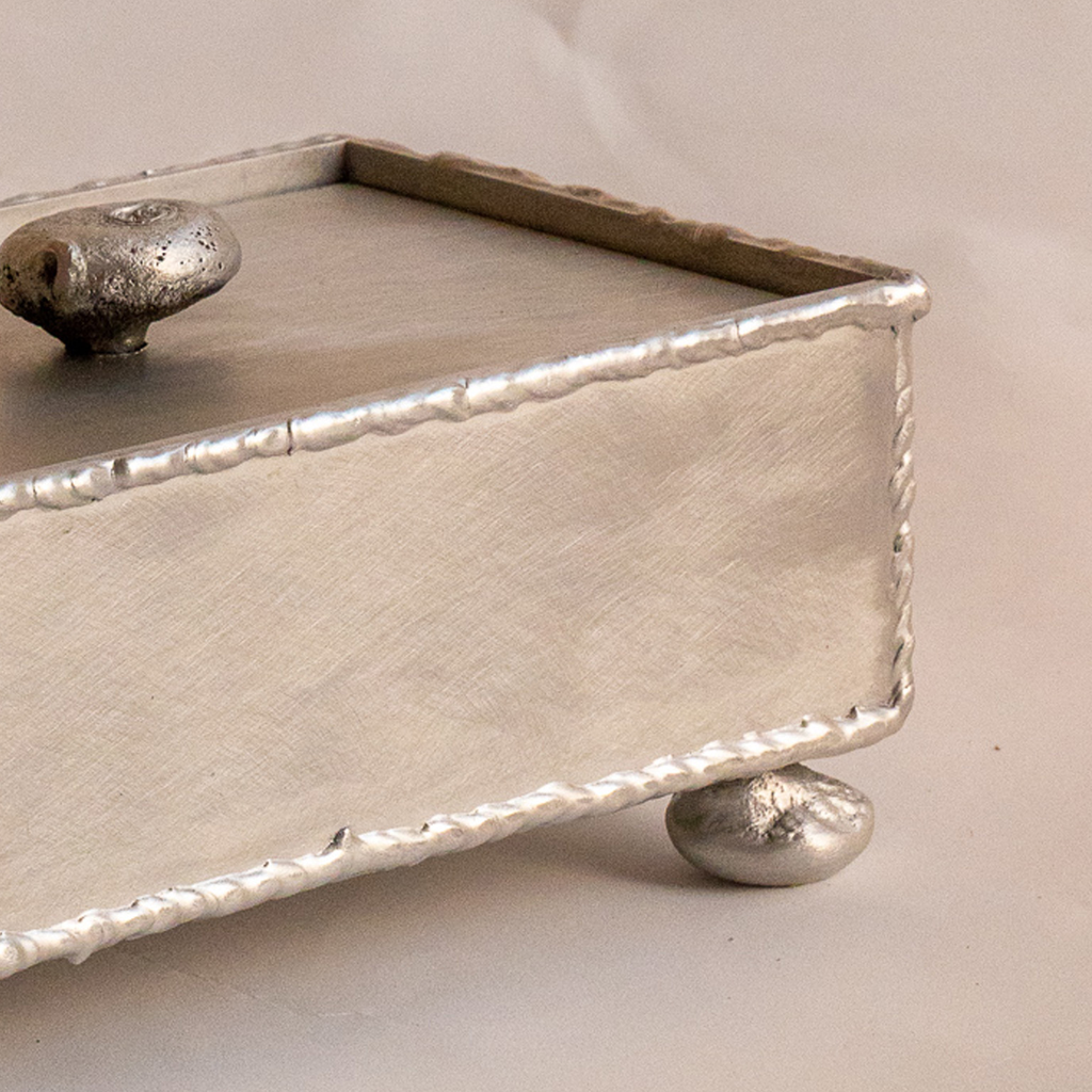 This box is designed to store all of your favourite and most precious items. With expressive welding and hand cast elements this piece embodies the elegant and imperfect ethos of Six Dots. In Six Dot’s signature raw aluminium, the piece blends seamlessly into any colour pallet or interior. At each stage of the design there was a commitment to showing the hands of the maker in the piece, each grind mark, scratch and scuff revel a story about the tools and hands that created the piece. Each of these pieces is hand made in our North London Workshop. Each piece will be marked for authenticity. We make these pieces by hand.