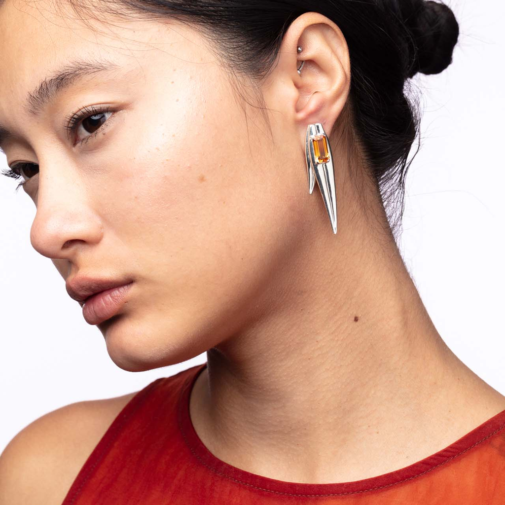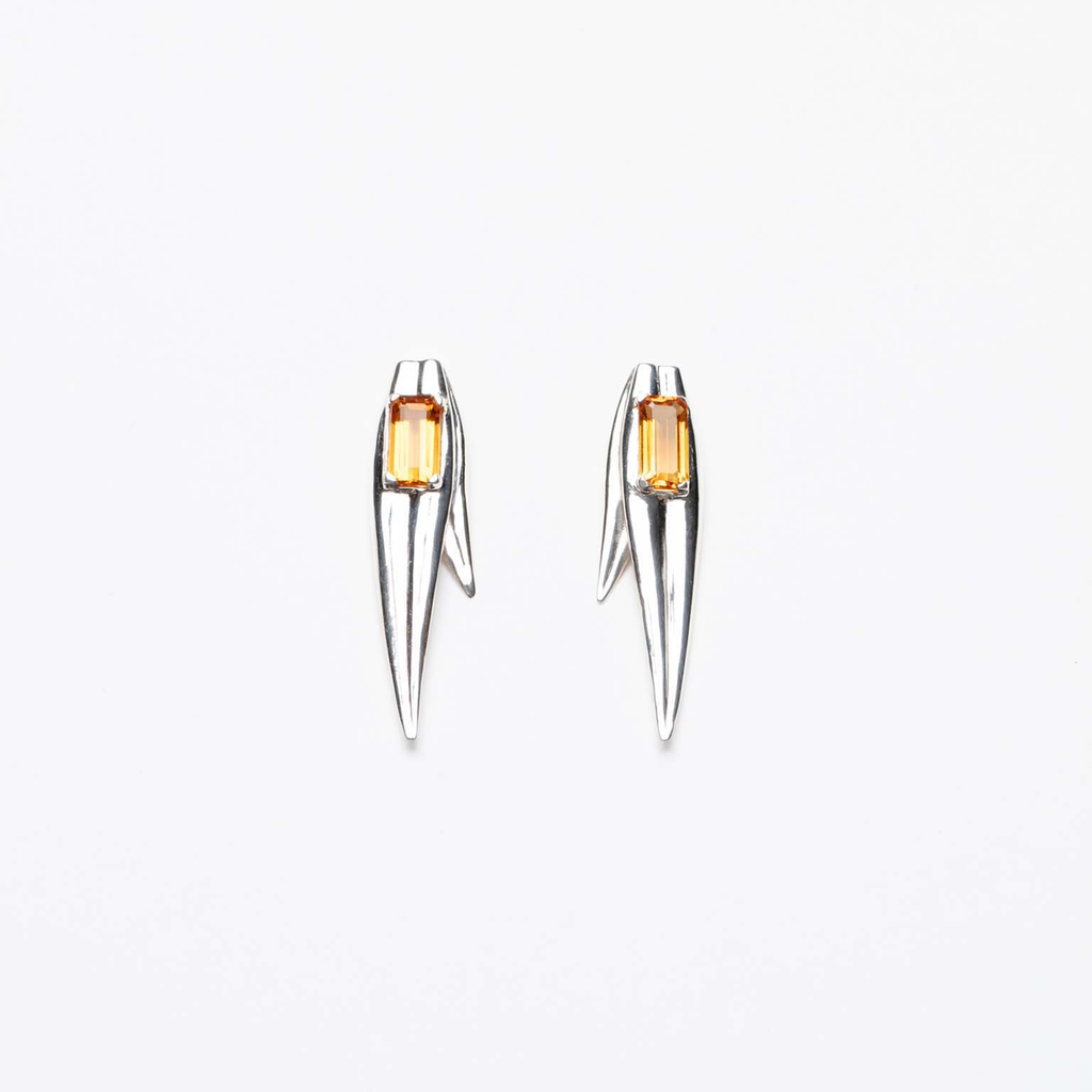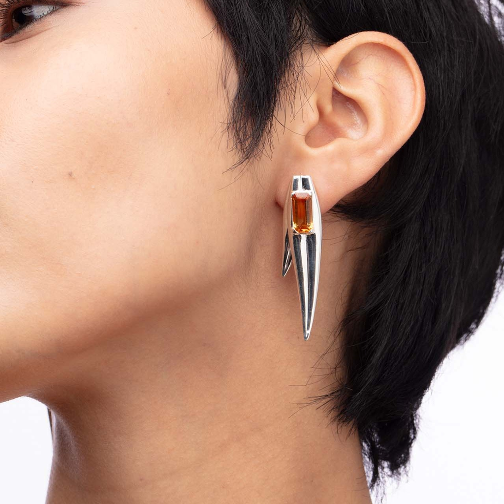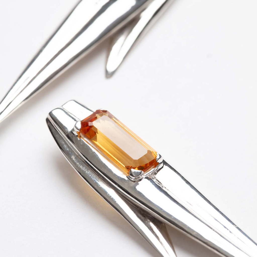 Earrings with octagonal Citrine stones in the shape of Caballitos de Totora, a Totora leaf boat. Built by the Chimú and Moche cultures of the region of Trujillo, Peru.