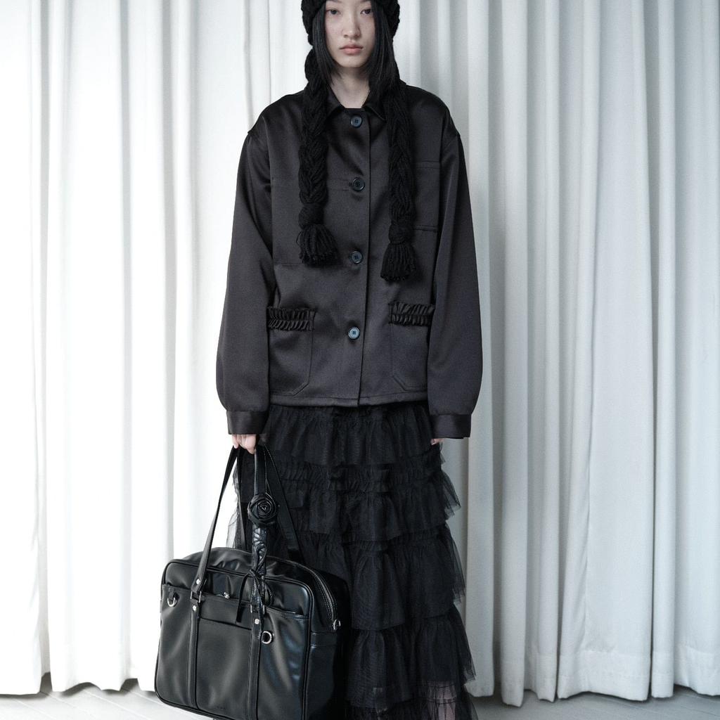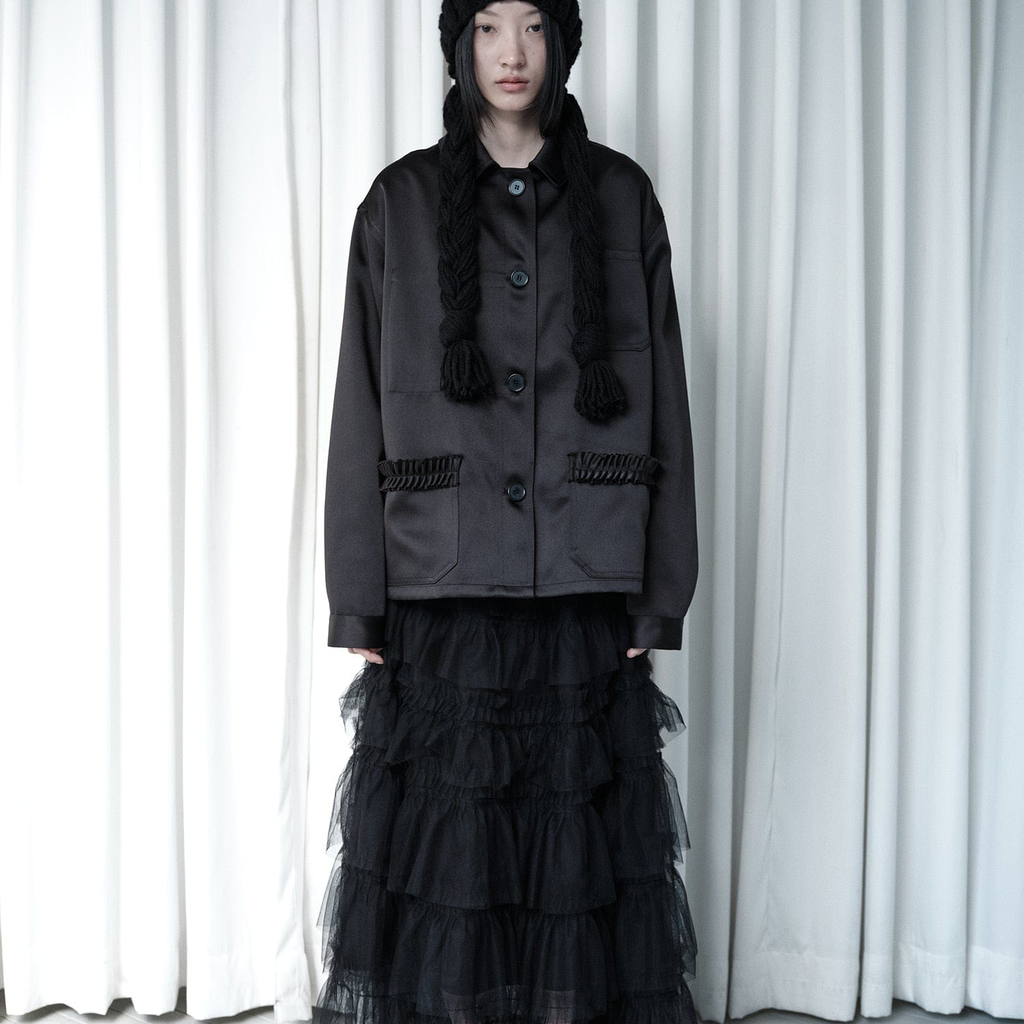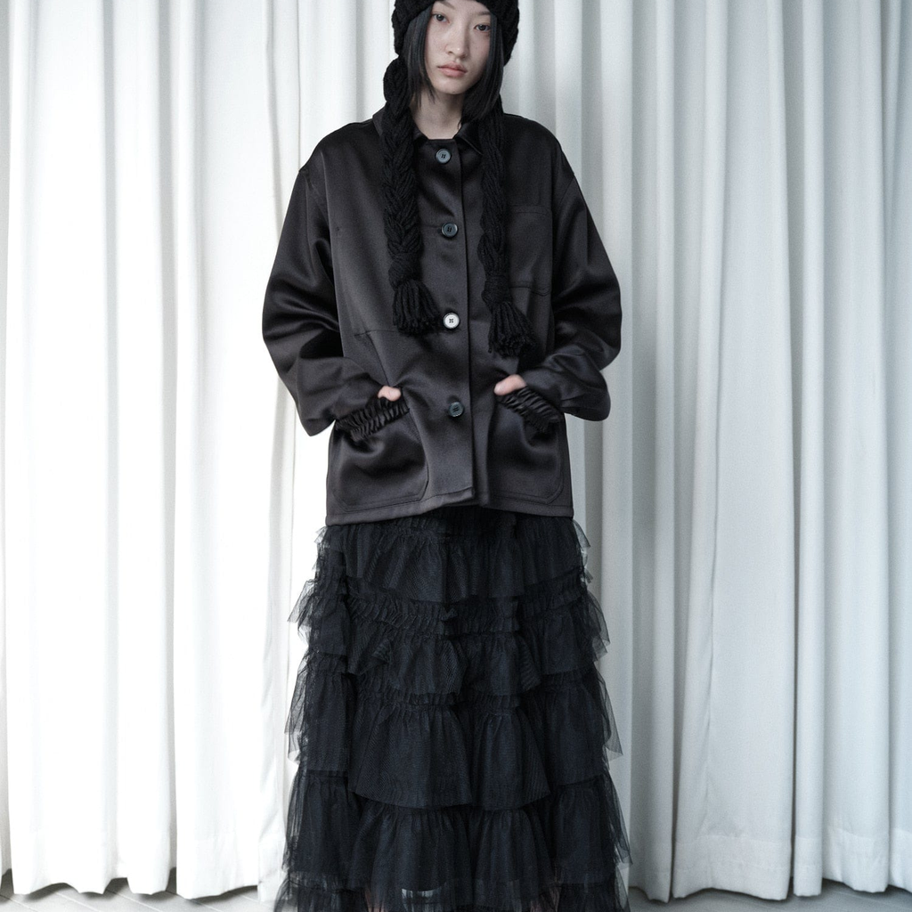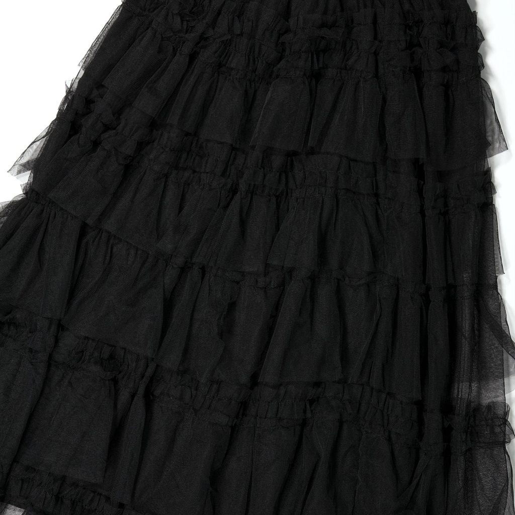This long skirt features layered tiers of soft black tulle, creating a dramatic and airy silhouette. The elastic waistband allows for a comfortable fit across various body types, while the semi-sheer tulle adds depth when layered.