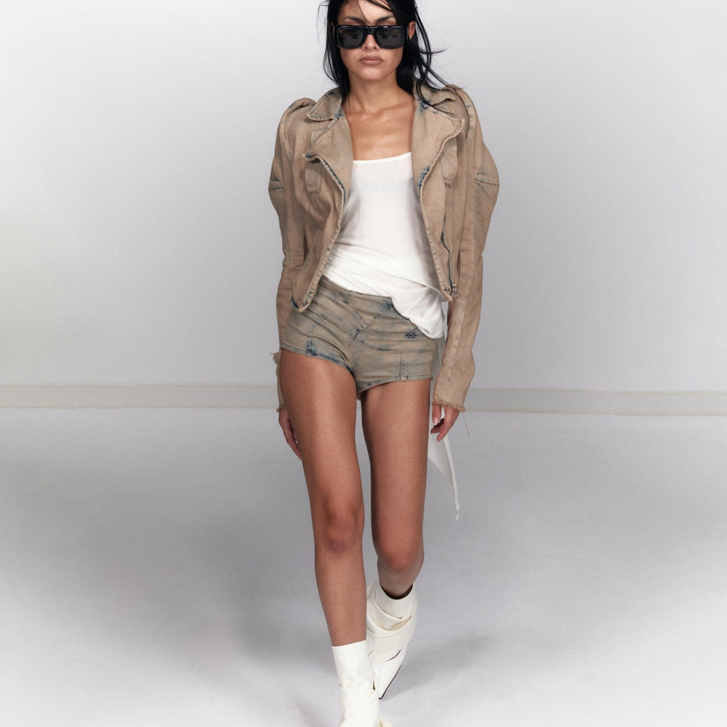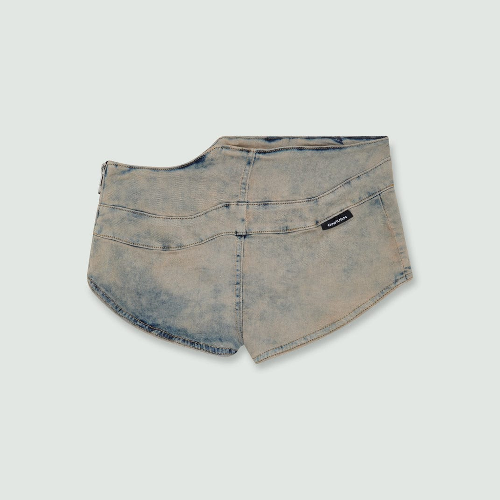 Twirl Hot Pants in mudwash denim. Double stitched panel seams. Side zip closure. Mid-rise with slim fit.