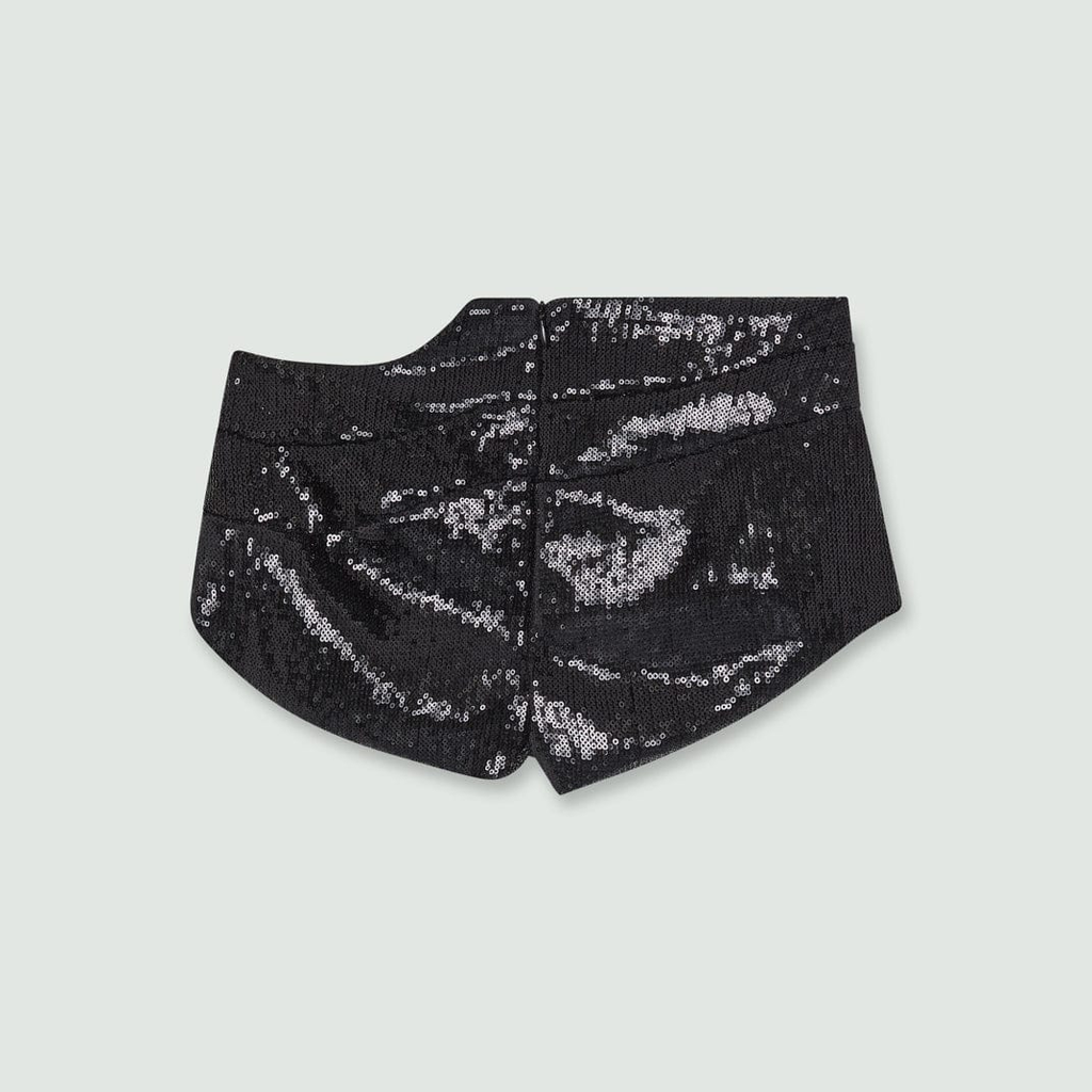 Twirl Hot Pants in black sequined stretch fabric with soft lining. Double stitched panel seams. Side zip closure. Mid-rise with slim fit.