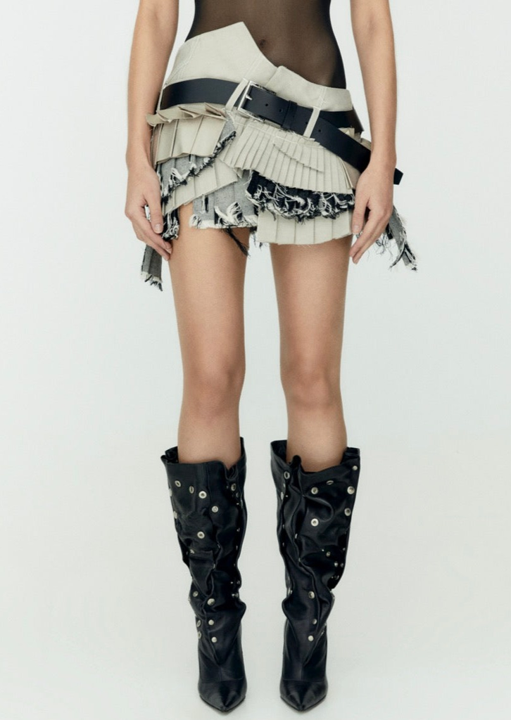 SS23 Twirl Mini in non-stretch gabardine. Knife pleats in a combination of denim, gabardine and nylon. Comes with matching ‘TWIRL’ leather belt. Each piece made individually so pleat formation cannot be 100% guaranteed to look exactly like the piece displayed.