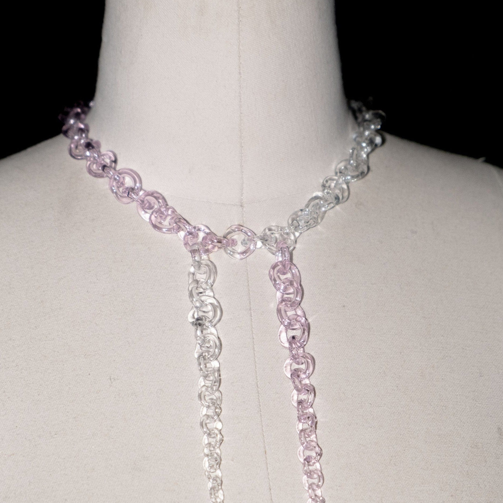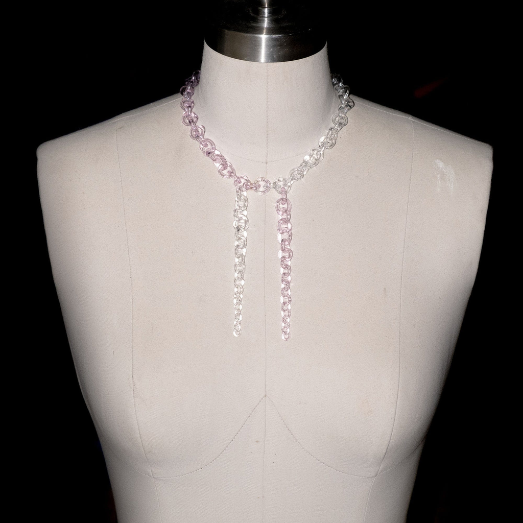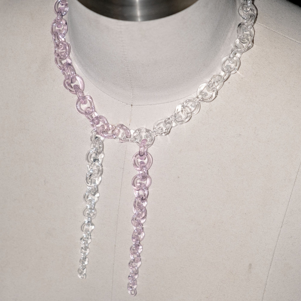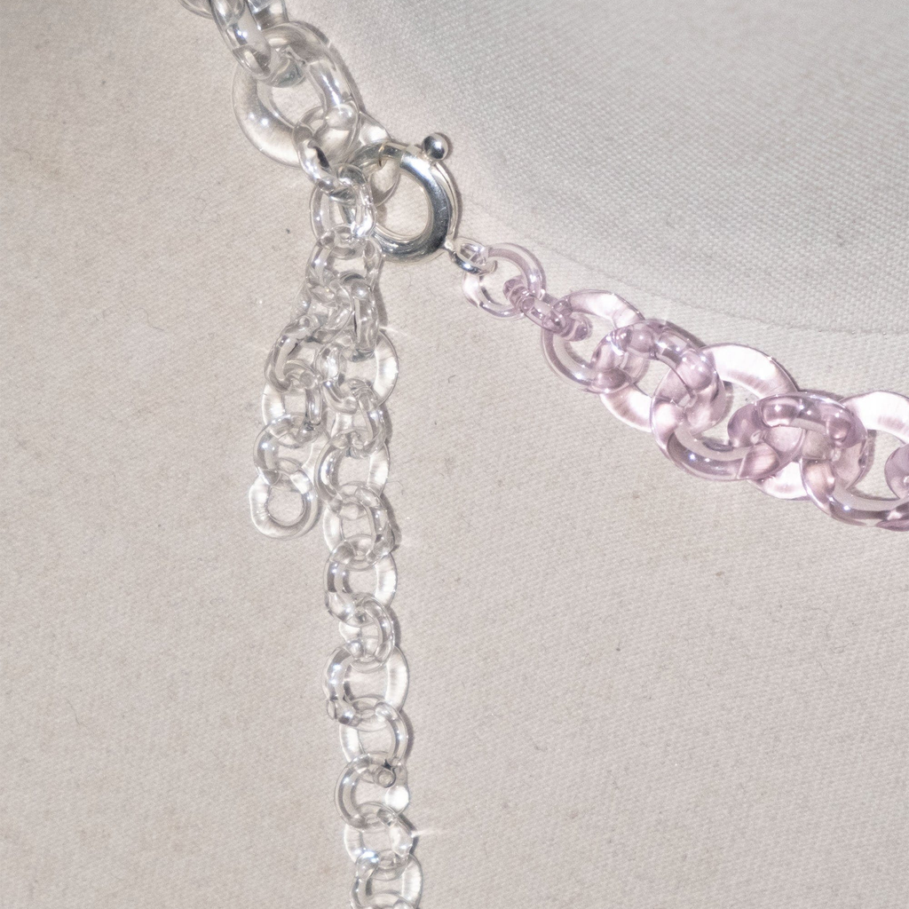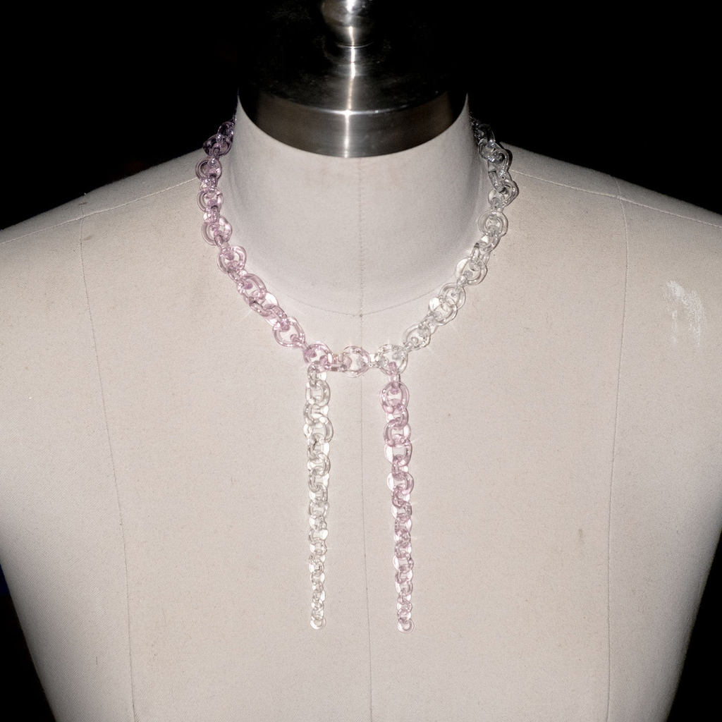 Subtle yet bold glass chains, handmade from borosilicate glass. Each necklace is crafted with precision and care. The necklace is adjustable in size, allowing it to be worn as a choker or longer piece.
