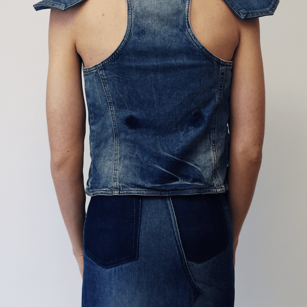 Cropped vest made of recycled denim with jeans' back pocket as shoulder pads