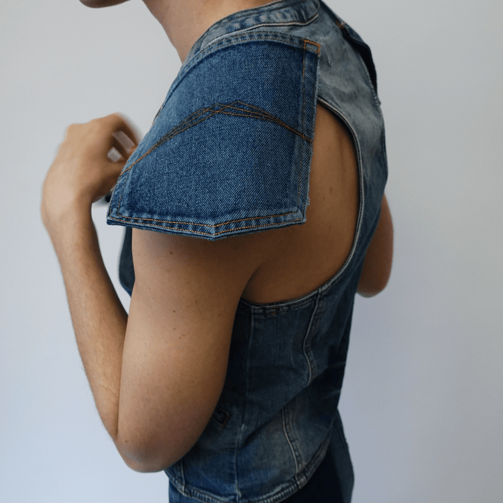 Cropped vest made of recycled denim with jeans' back pocket as shoulder pads
