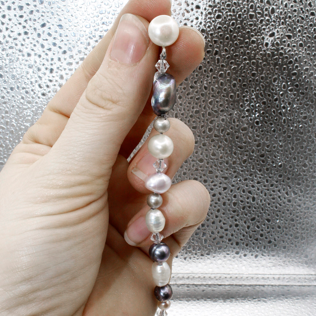 Sterling silver, freshwater pearls, Swarovski crystals, silk tread. -