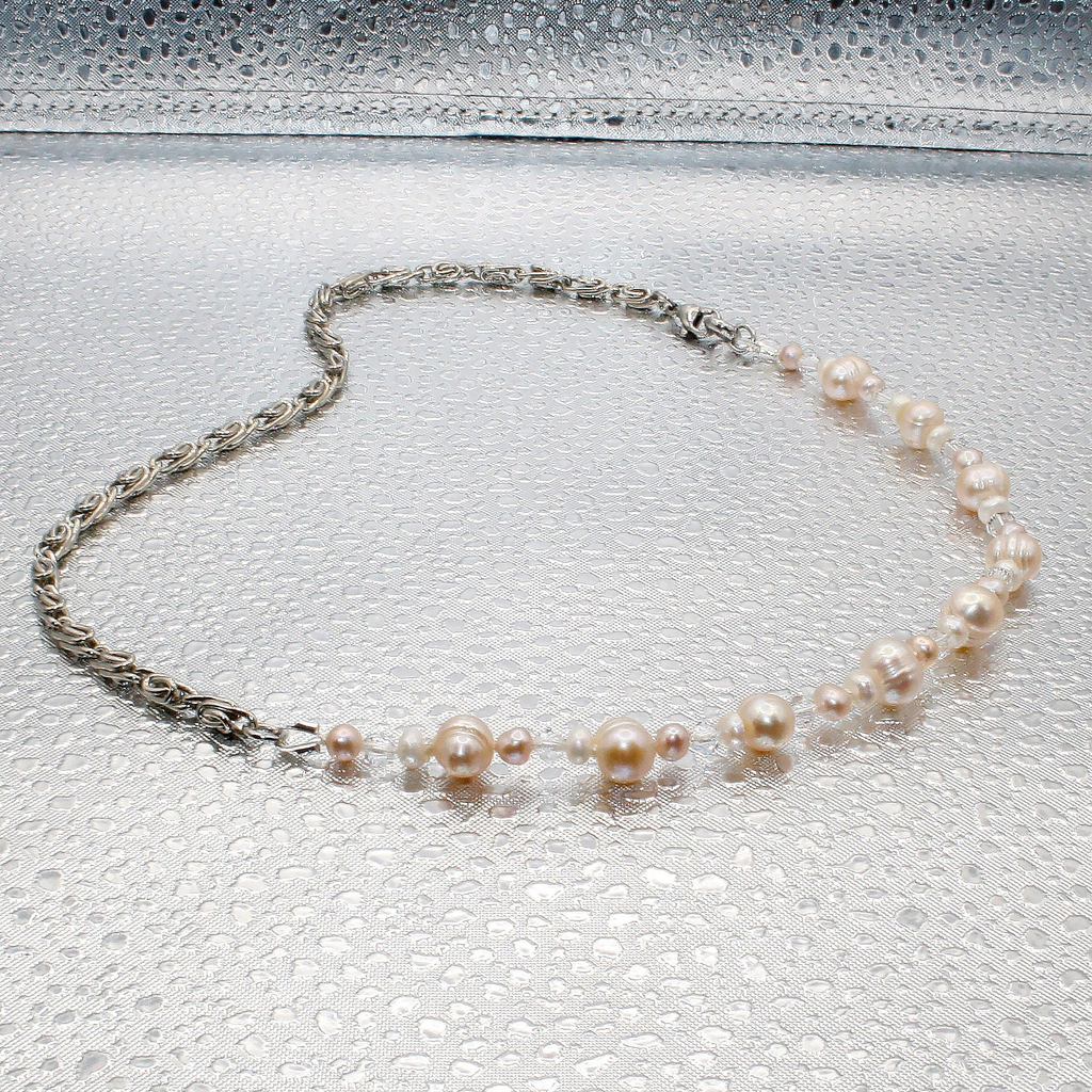 Main: Steel, freshwater pearls, Swarovski crystlas, silk tread.